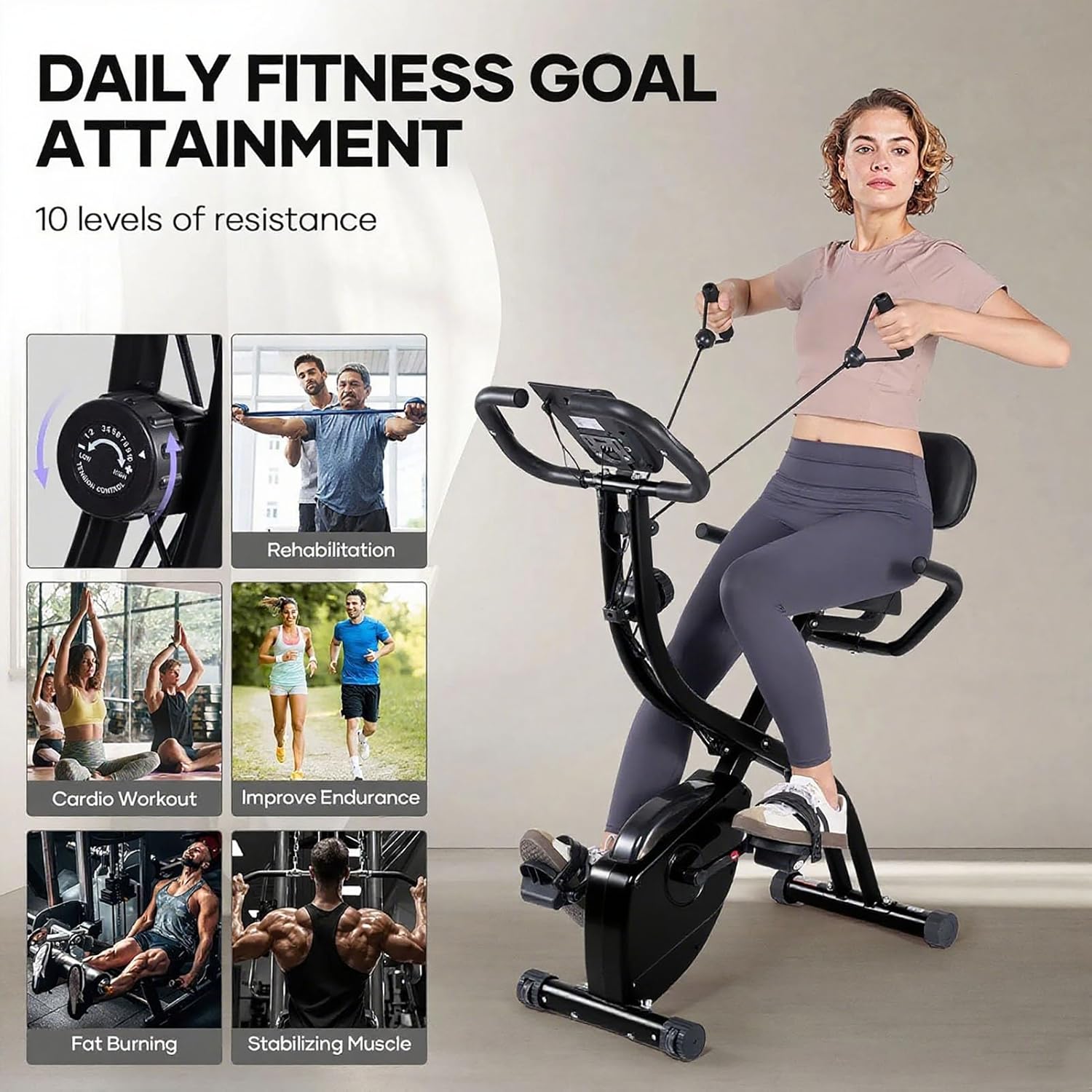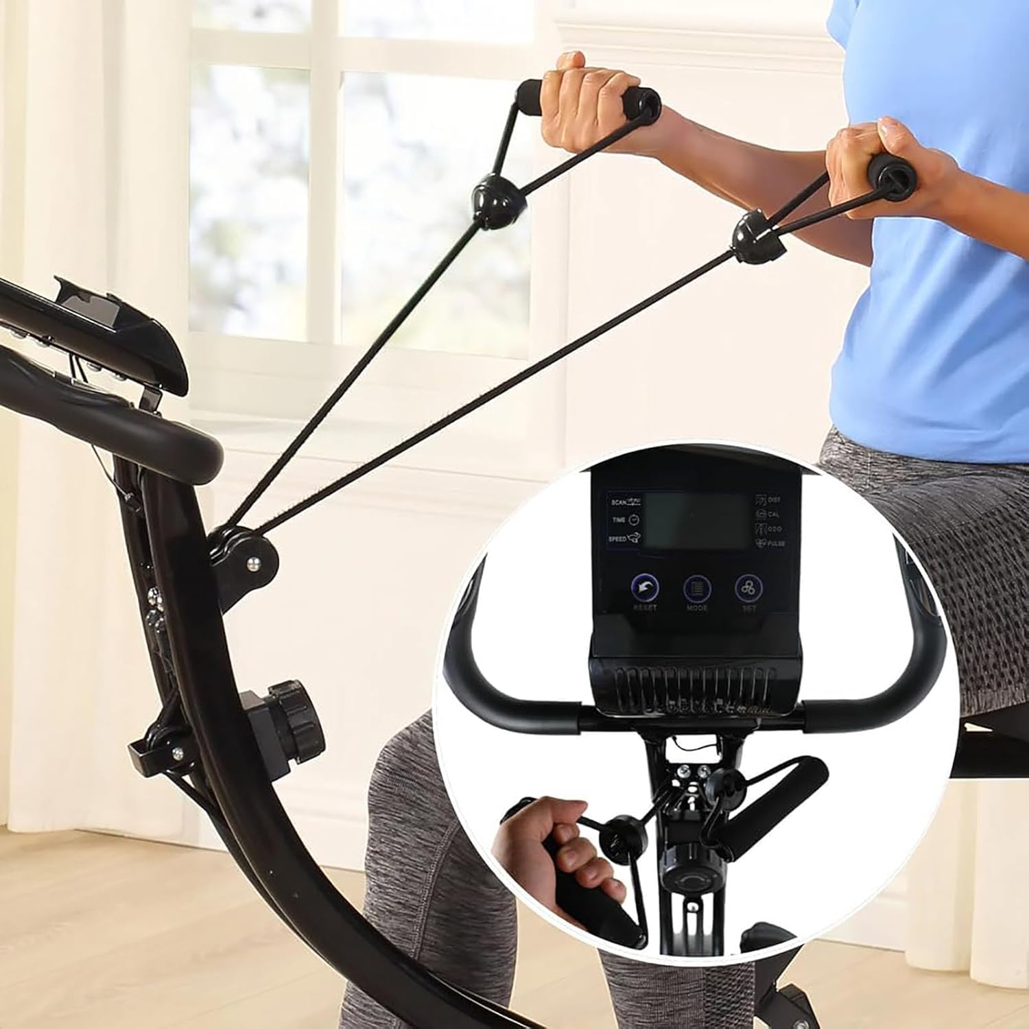 ADJUSTABLE MAGNETIC RESISTANCE SYSTEM – With 10 customizable resistance levels, this exercise bike allows users to customize workout intensity. The smooth, virtually silent magnetic resistance mechanism ensures a distraction-free exercise experience. Built-in upper body resistance bands allow for synchronized muscle activation.
