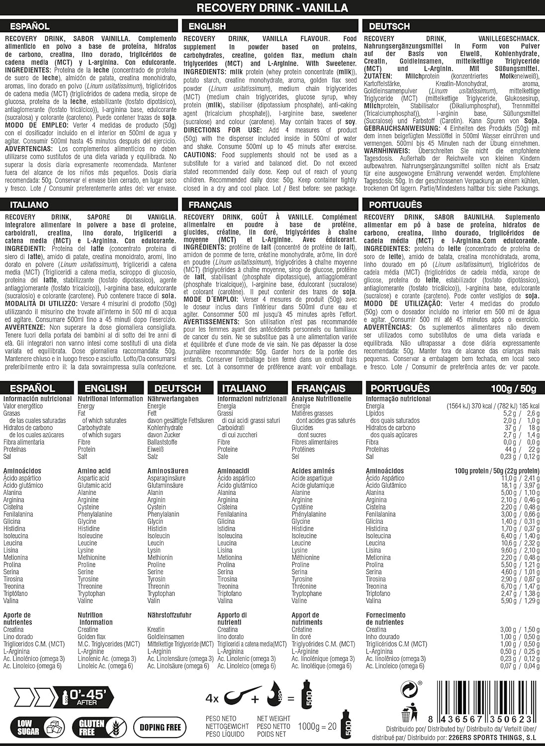 👍♂️ RECOVERY DRINK: Muscle recovery powder based on high-quality whey protein, carbohydrates, creatine, golden flax, medium chain triglycerides (MCT) and L-arginine