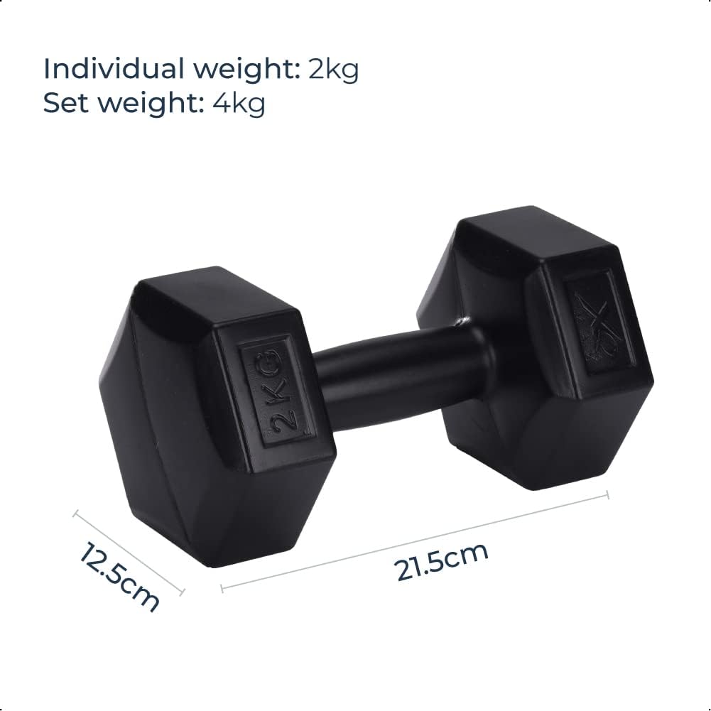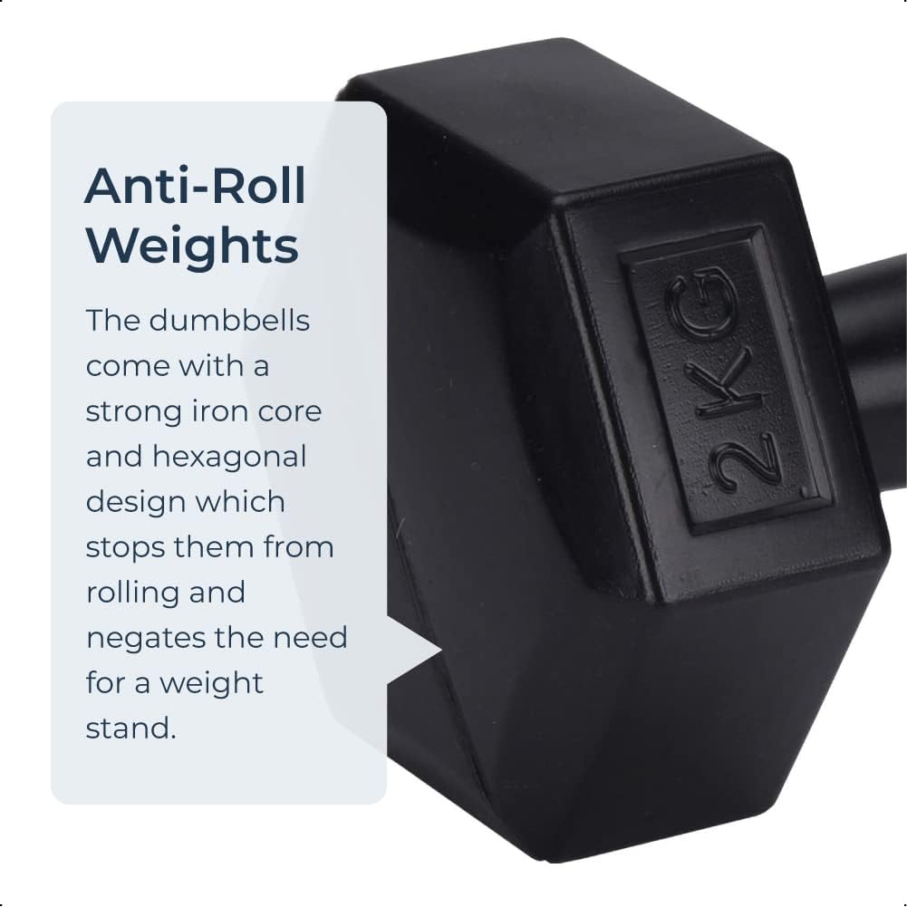 Las mancuernas vienen con un fuerte núcleo de hierro y diseño hexagonal que evita que rueden y niega la necesidad de un soporte de peso.