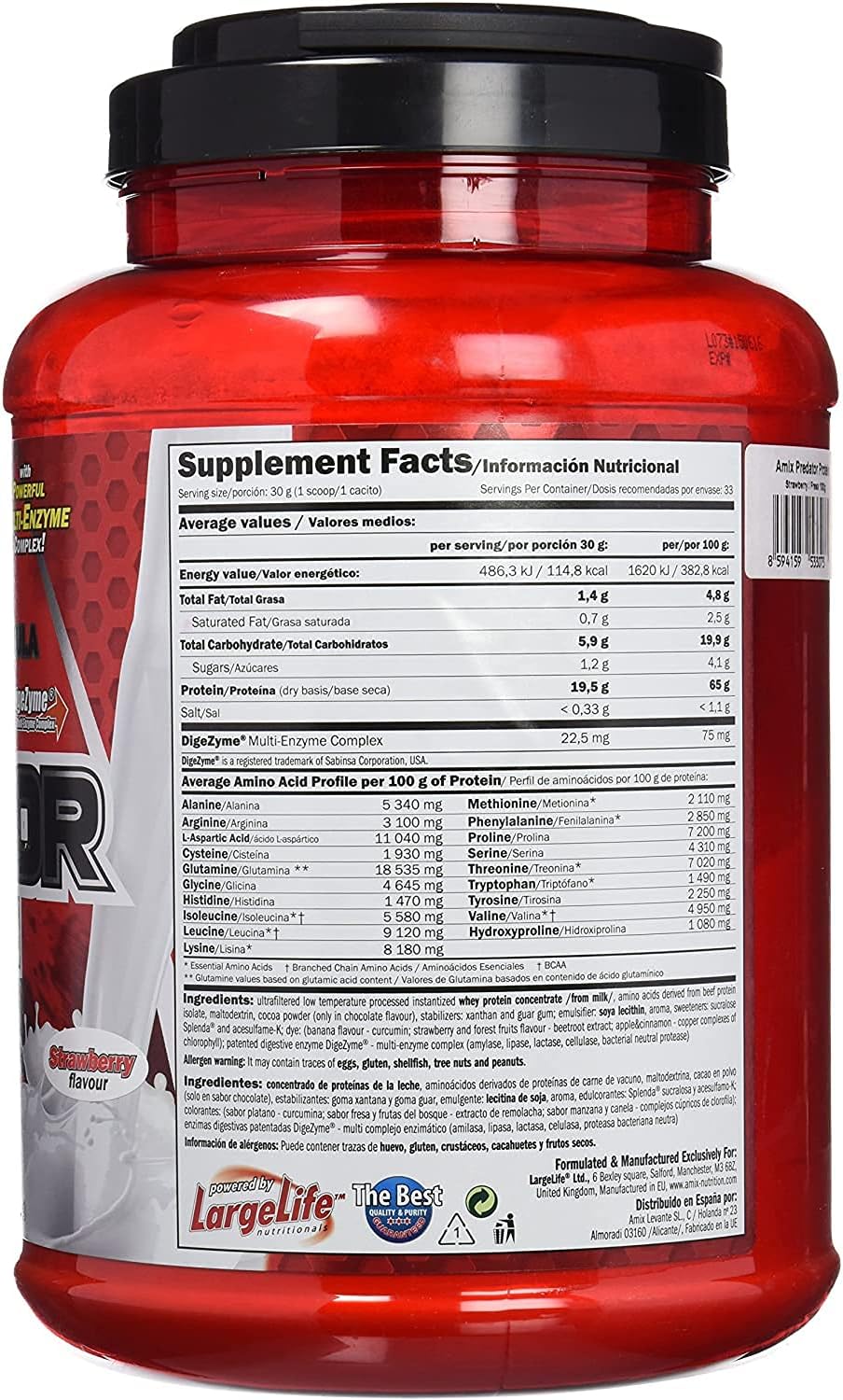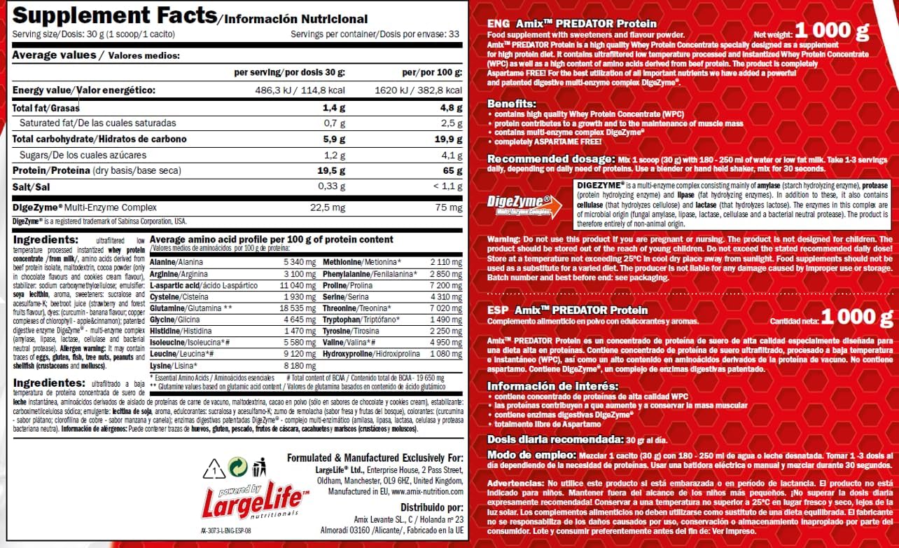 Amix PREDATOR Protein is a high quality whey protein concentrate specially designed for a high protein diet. Excellent taste and texture contains ultra low temperature filtration of whey protein concentrated (W.P.C.) as well as amino acids derived from beef proteins. This amix protein contains Splenda sucralose sweetener that does not contain aspartame. Contains DigeZyme a proprietary digestive enzyme complex.