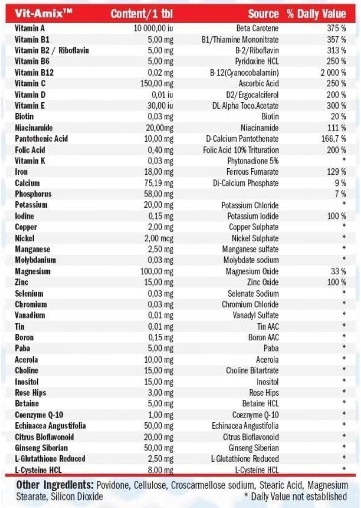 VITAMINS IN TABLETS: The Amix vitamin complex has a convenient format of 120 tablets. Recommended daily dose: take 1 tablet daily, preferably after the midday meal, accompanied by 200 ml of water. Warning: Do not exceed the recommended daily dose.