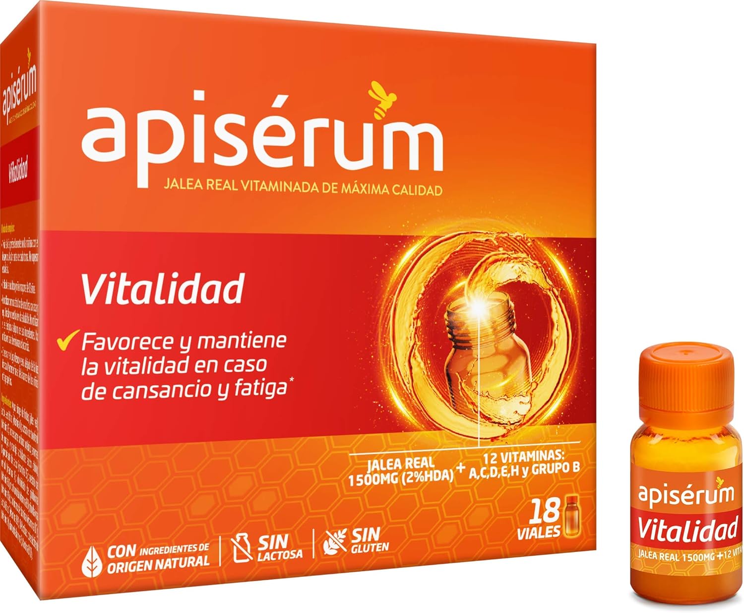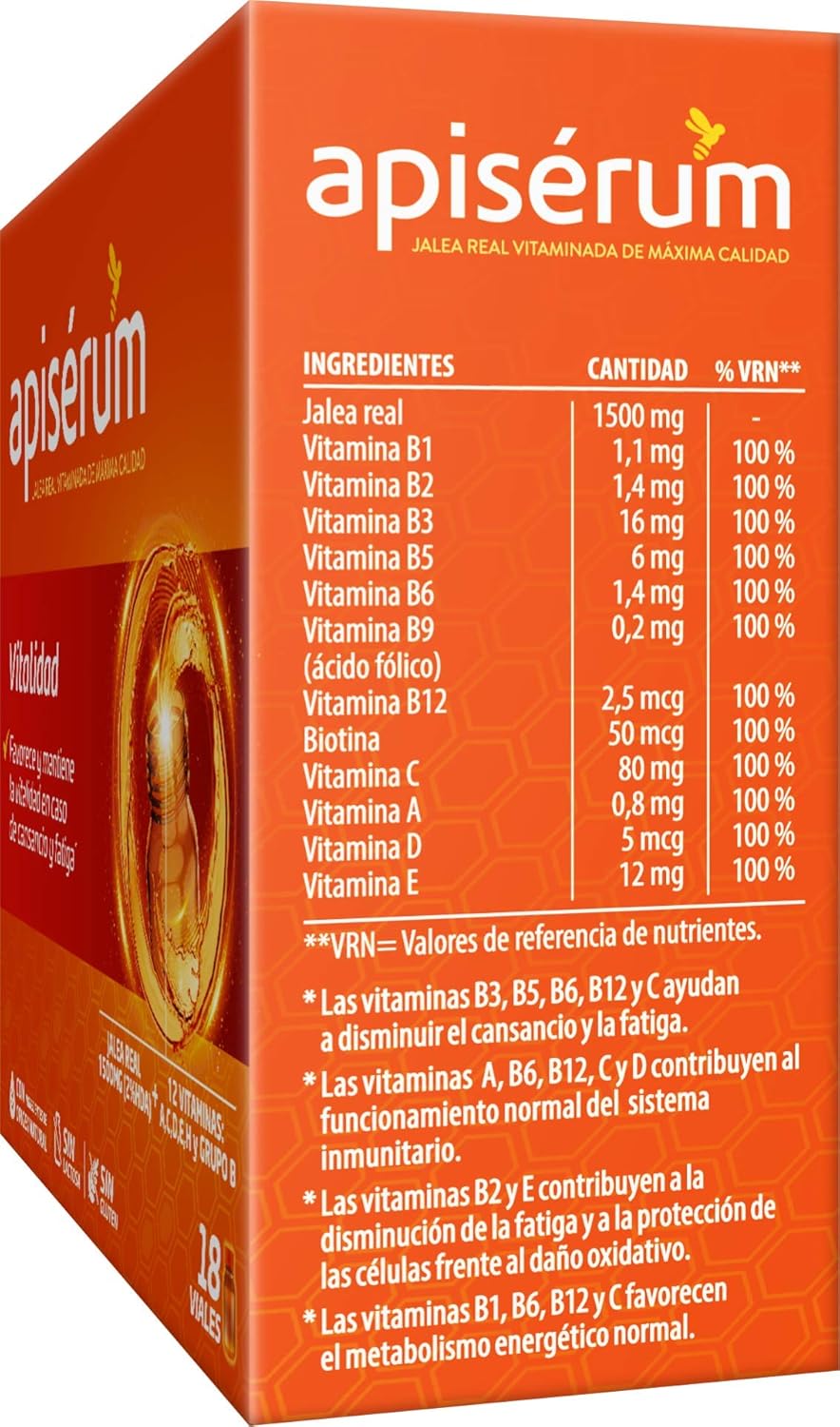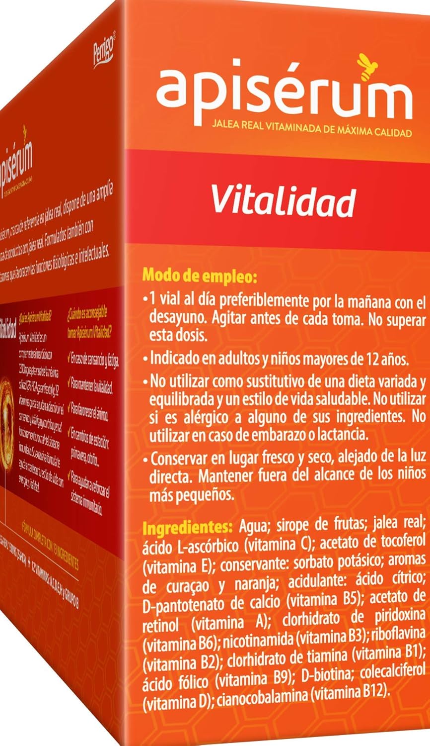 Apisérum Vitality is a food supplement containing high quality Royal Jelly, Vit. A, Vitamins of group B (B1, B2, B3, B5, B16, B9, B12), Vit. C, Vit D, Vit E and Biotin help you reduce tiredness and fatigue and contribute to the normal functioning of the immune system. Its unique formula helps you maintain your lifestyle with energy and vitality