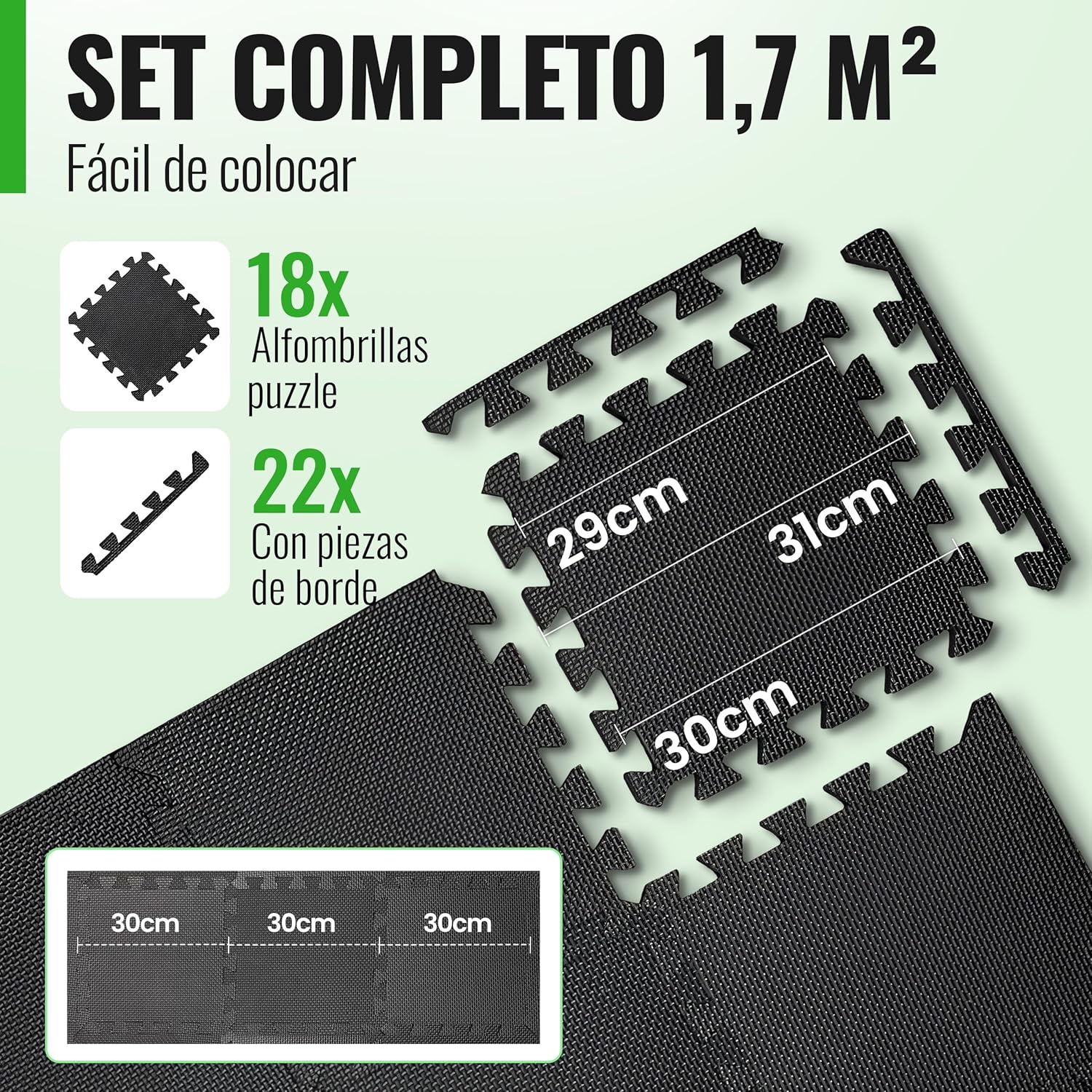 FITS ANY SPACE – 18 interlocking floor tiles (30 x 30 cm) + 22 practical edges. Flexible and modular protection, ideal for the gym, living room or children’s room.
