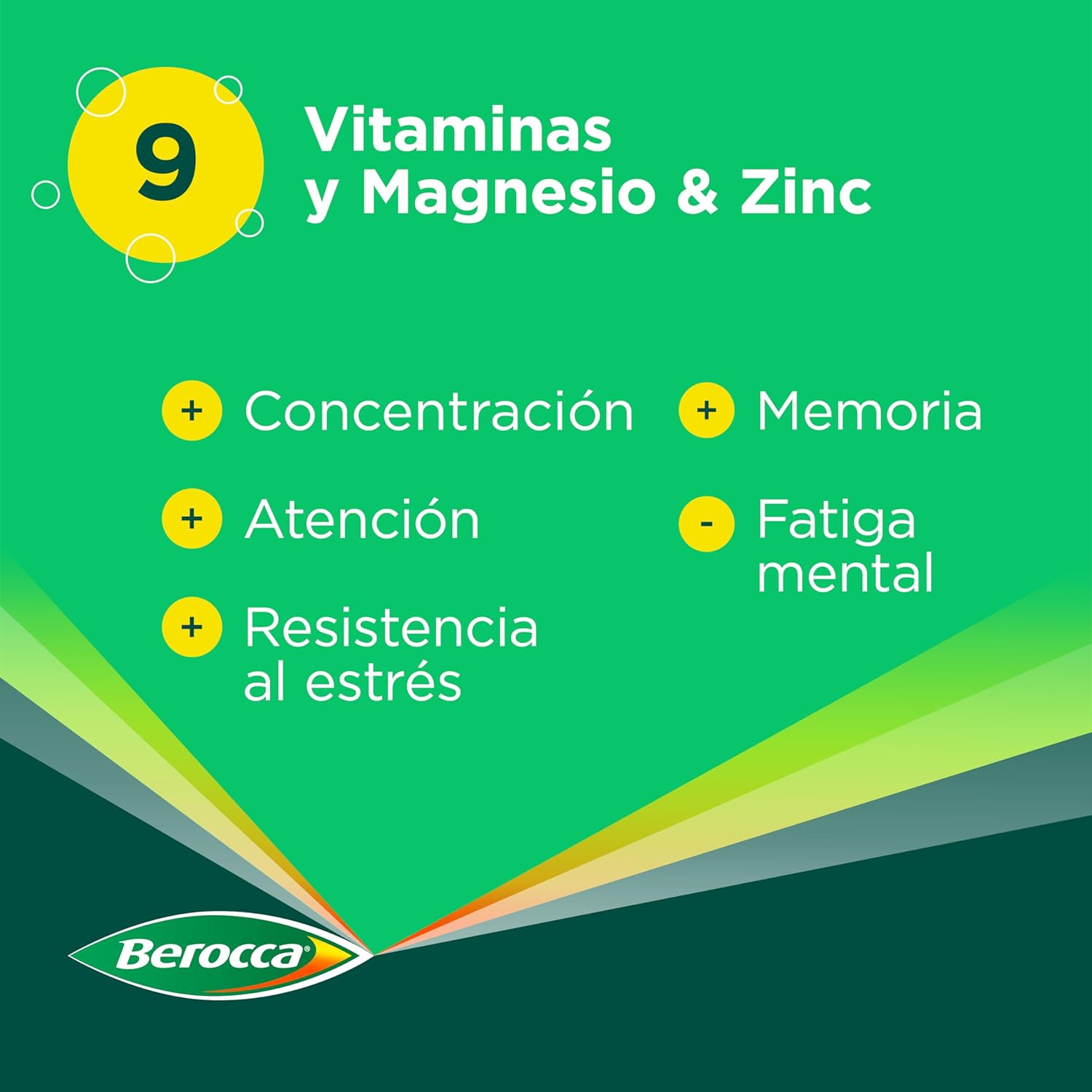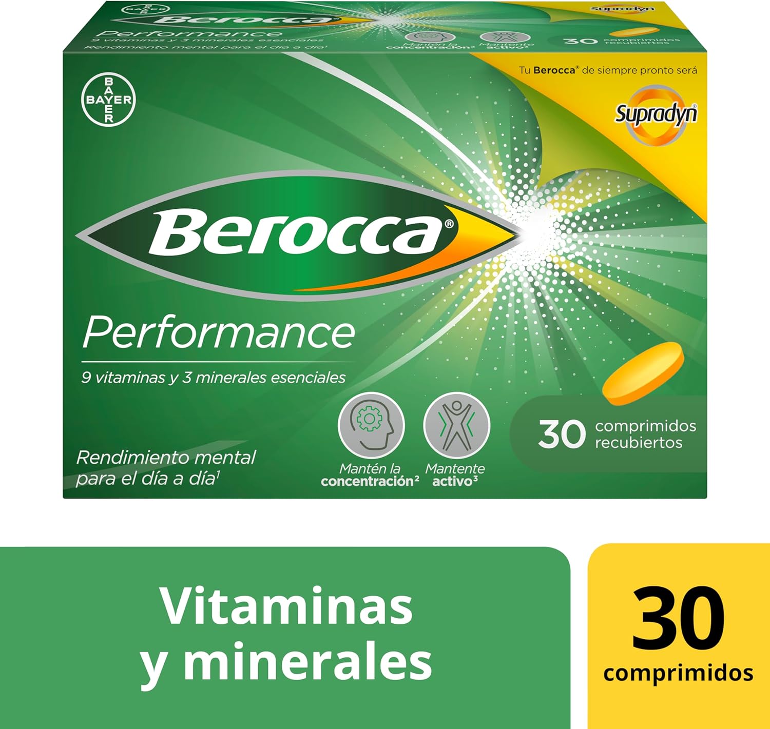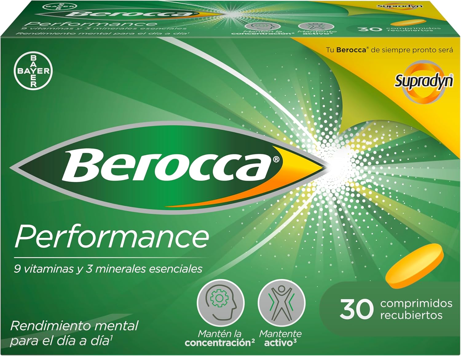 Product Description BEROCCA BOOST – 60 tablets Berocca Performance is a specific combination of vitamins and minerals tested with clinical studies that thanks to its B vitamins, vitamin C and minerals contributes to mental and physical performance and the reduction of fatigue. Clinically tested formula: – Vitamins B (niacin, B2, B1, B6, Biotin, B12), C and magnesium help the proper functioning of the nervous system and normal energy metabolism. – Vitamins B (niacin, B1, B6, Biotin, B12, folic acid), C and magnesium help normal psychological function. Pantothenic acid contributes to the synthesis and normal metabolism of some neurotransmitters. – Zinc contributes to normal cognitive function such as concentration, learning, memory, stress resistance. – Magnesium, vitamin B2, B6, B12, niacin, pantothenic acid, folic acid and vitamin C all contribute to decrease tiredness and fatigue. – Magnesium by itself promotes the normal functioning of muscles – Calcium contributes to the normal functioning of neurotransmitters Age: 18+ Vitamins and minerals: Vitamins B and C, Magnesium, Calcium and Zinc Effect: Mental and physical performance Others: No artificial stimulants. Not recommended for use in children under 18 years or during pregnancy or breastfeeding. Why take it? Ideal for students or young professionals, who need to help their intellectual performance continuously or in situations of intense intellectual activity. How to take it? 1 tablet per day Ingredients: L-ascorbic acid; Calcium carbonate; Magnesium carbonate; Anti-caking agents: polyvinylpyrrolidone, interlaced sodium carboxymethylcellulose, talc, magnesium salts of fatty acids; Magnesium oxide; LACTOSA; Nicotinamide; Bulking agents: mannitol, stearic acid, microcrystalline cellulose; Coating agents: hydroxypropylmethylcellulose, hydroxypropylcellulose; Zinc citrate; Calcium D-pantothenate; Riboflavin; Thiamine mononitrate; Rice starch; Pyridoxine hydrochloride; Pteroylmonoglutamic acid; Dyes: iron oxides; D-biotin; Cyanocobalamin. address 1 tablet per day and get what you propose Safety warning Consult Packaging See more