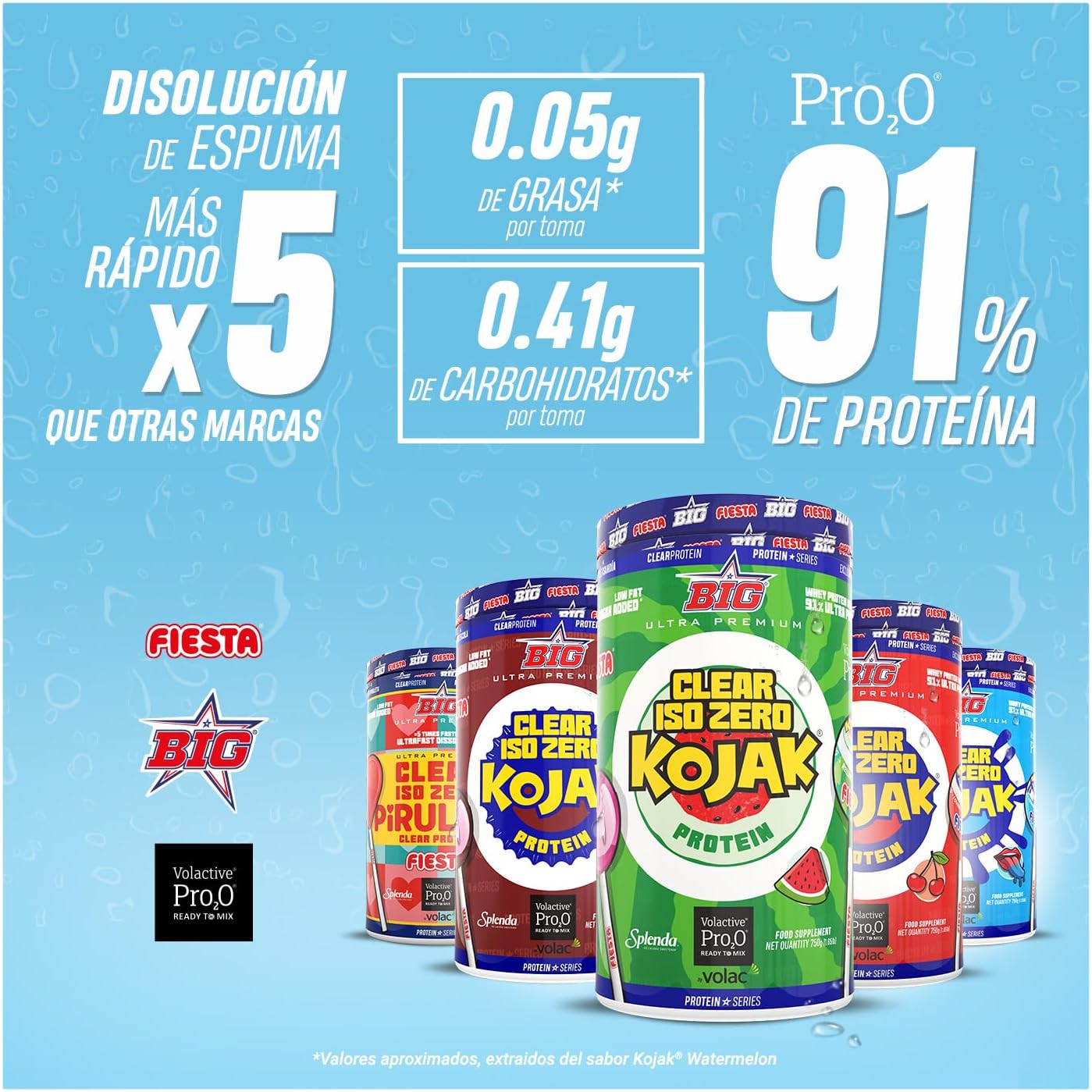 CLEAR ISO ZERO KOJAK from BIG is an ultra-premium clear protein made with Volac’s prestigious Volactive Pro2O Ready to Mix patent. This protein stands out for its purity, containing on average 97.1% of crude raw material, which guarantees high quality and efficiency. Its advanced formula allows for fast and clump-free dissolution, up to five times faster than other clear proteins available on the market. Plus, CLEAR ISO ZERO KOJAK is extremely low in fat and carbohydrates, with only 0.05% fat and 0.41% carbs per serving, making this supplement an ideal choice for those looking to maintain a balanced diet while increasing their protein intake. This protein is available in a range of exclusive flavors developed in collaboration with the Fiesta brand, including options such as Watermelon, Blackberry, Cola and Cereza Original, which evoke authentic childhood flavors with superior nutrition. Volactive Pro2O Ready to Mix technology ensures protein blends easily without excessive foaming or bitter aftertaste, common problems in other clear proteins. This not only improves the consumption experience, but also ensures an efficient intake of high-quality protein, including elevated levels of leucine and BCAA’s essential for muscle growth and recovery. With over 10 years of experience and recognition in the sports supplementation industry, BIG ensures quality and safety in all its formulations, using the best raw materials and blending, packaging and distribution technologies. For best results, it is recommended to add a scoop (25 g) to 250 ml of water, take a daily dose, preferably post-workout, and let the mixture stand for two minutes before consumption. In short, BIG CLEAR ISO ZERO KOJAK is the ideal clear protein for those looking for superior nutrition, exceptional taste and fast dissolution, all backed by quality and innovation of BIG.
