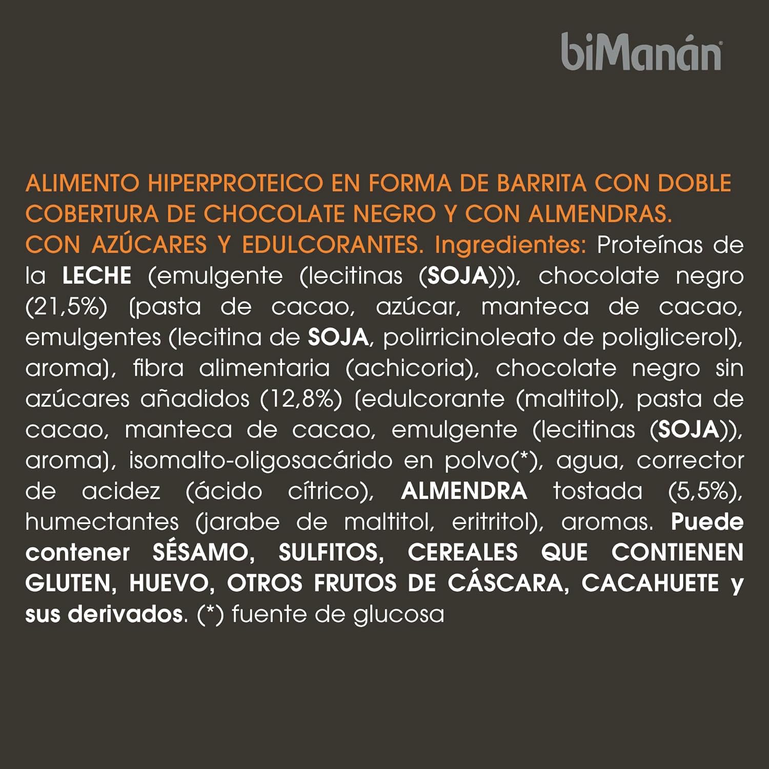 Hyperprotein food in the form of a bar with double coating of dark chocolate and almonds. With sugars and sweetener