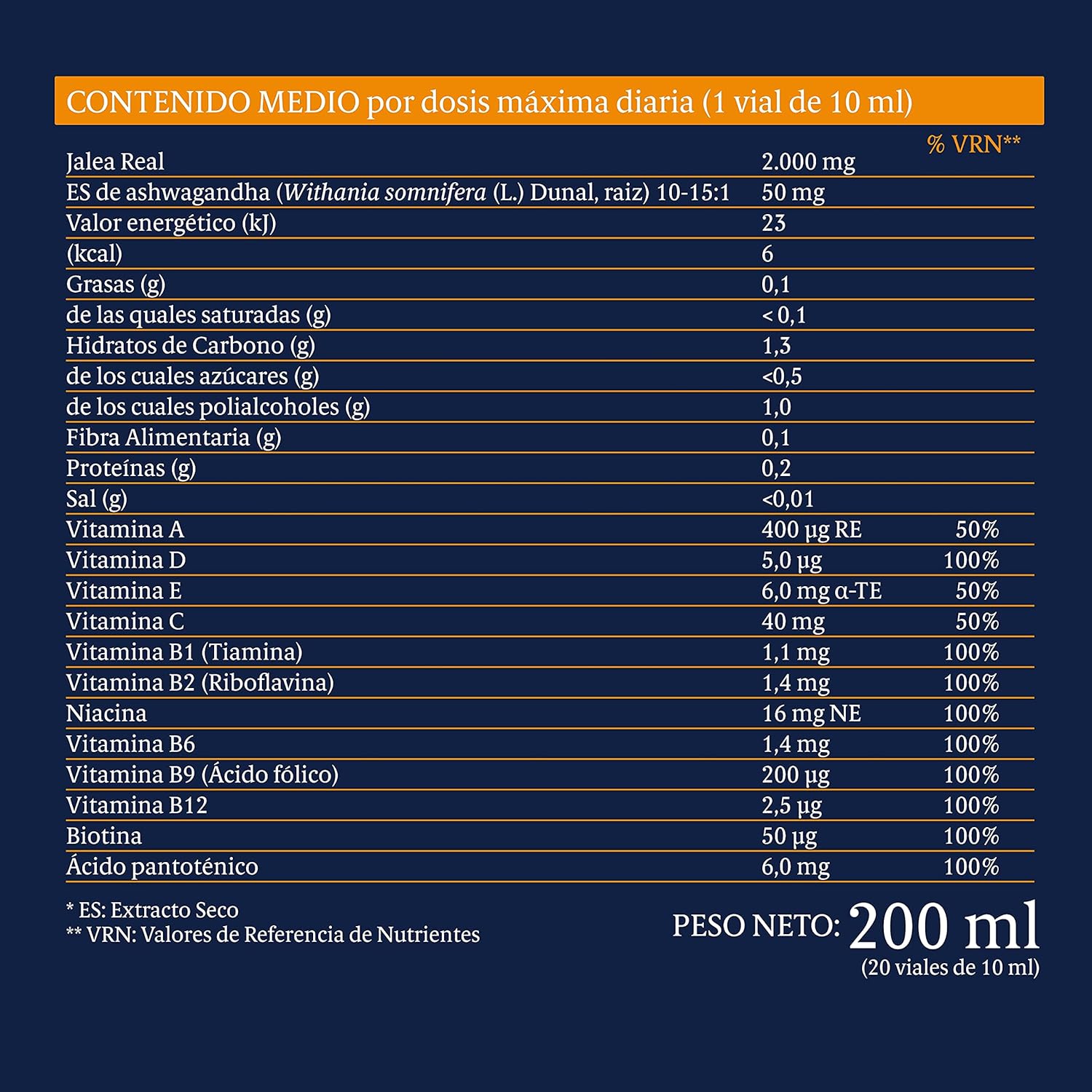Liquid food supplement based on Royal Jelly, 12 vitamins and Ashwaganda, plant that helps maintain energy and vitality levels