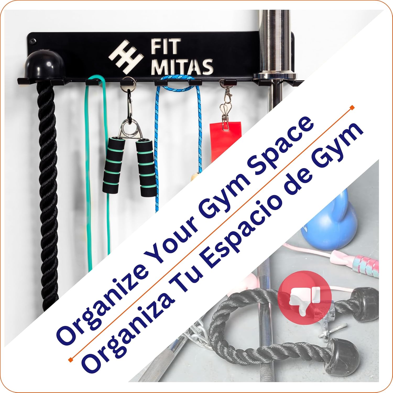 El rack de gimnasio #Fit Mitas cuenta con nueve ganchos en total con una longitud adecuada (13cm) que garantiza su versatilidad como uno excelente soporte para mancuernas, soporte para bloques de yoga, organizador de material de meditación y pilates o para colgar barras de pesas.