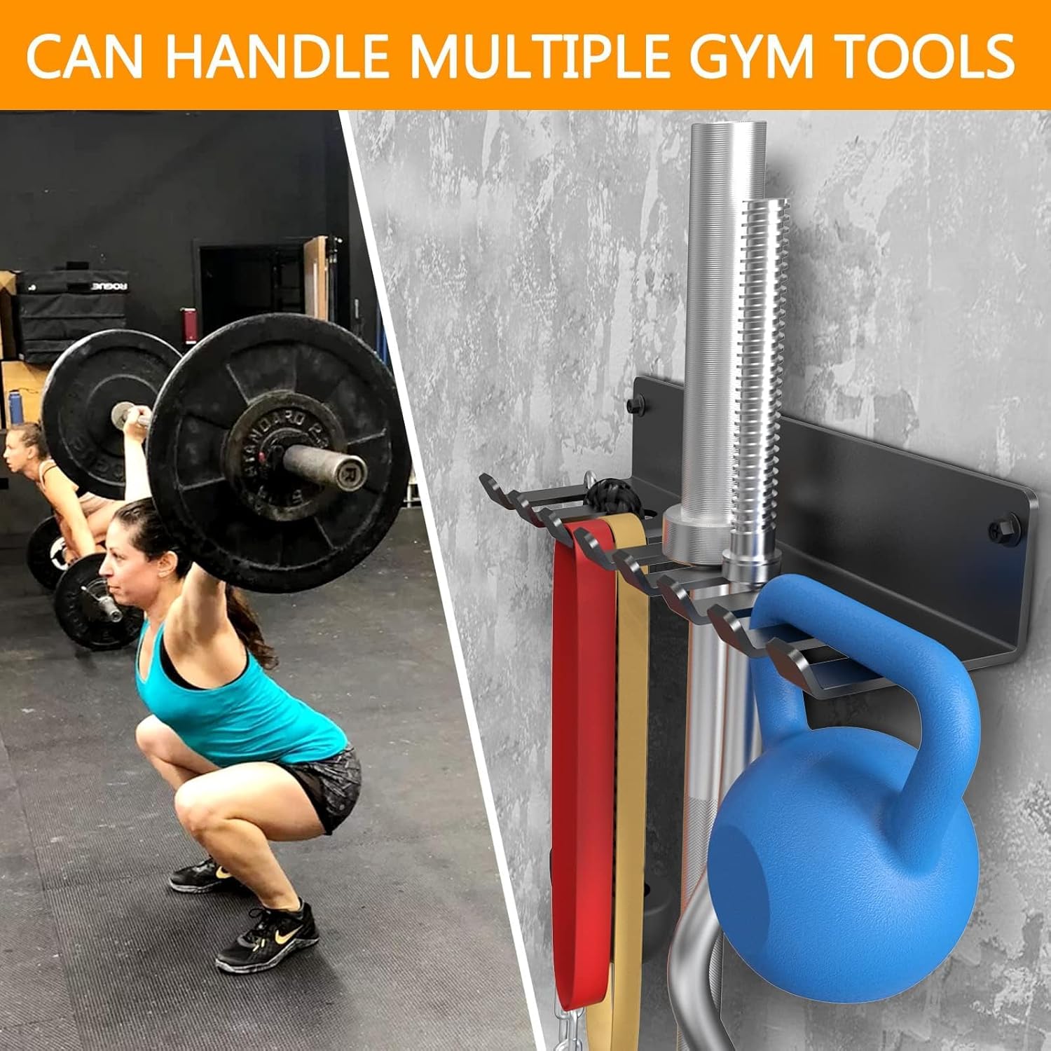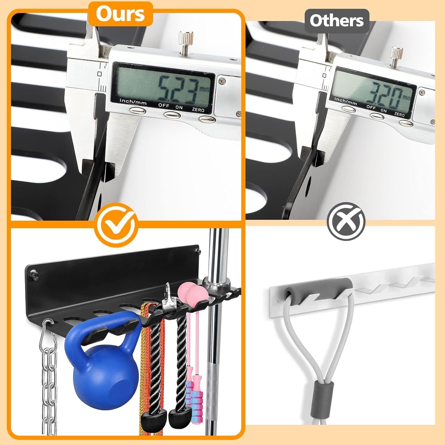 HEAVY STORAGE HANGERS – Optimally designed for weightlifting row handles, chains, Olympic dumbbells and dumbbells.