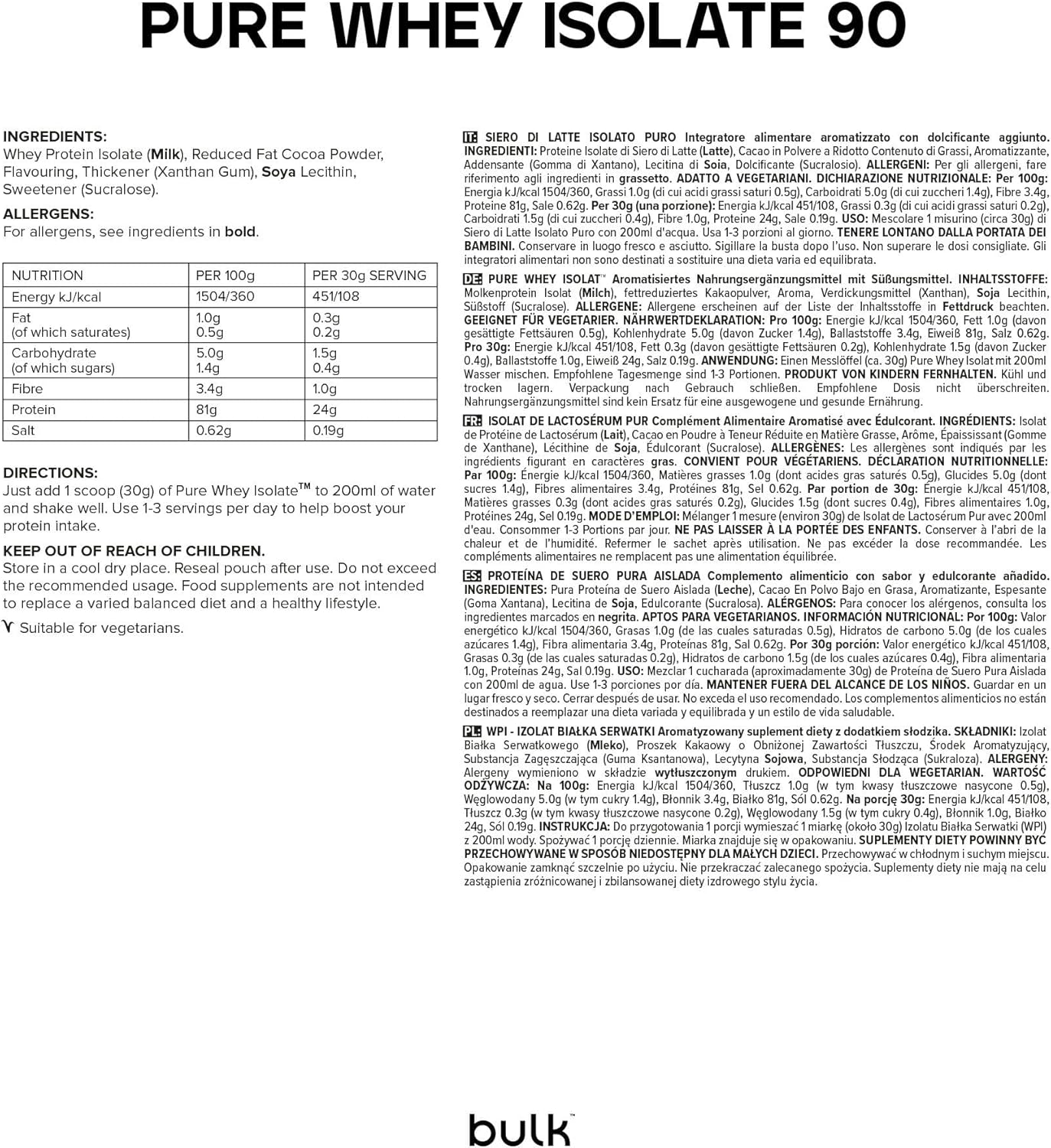 The main differences between regular whey protein concentrates and whey protein isolates are the nutritional values and processes the product goes through to cause these differences. Whey protein isolate tends to have a higher protein content compared to whey protein concentrate, where concentrates approx. 80% protein compared to the content of 90% isolates. With this increase in protein content, whey protein isolate contains less carbohydrates and less fat than whey protein concentrate. Whey protein isolate has a higher protein content due to its increased production processes. Whey protein isolates, such as Pure Whey Isolate 90, instead pass an advanced combination of cross-flow microfiltration and ultrafiltration. This extra step helps filter out some carbohydrates and fats, making the protein more concentrated. Bulk Whey Protein Isolate is available in a range of delicious flavors.