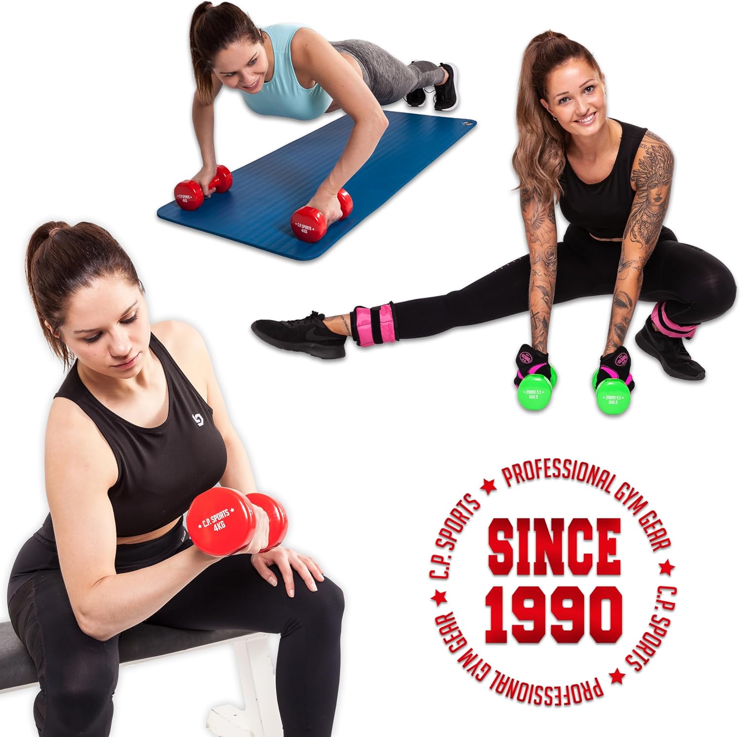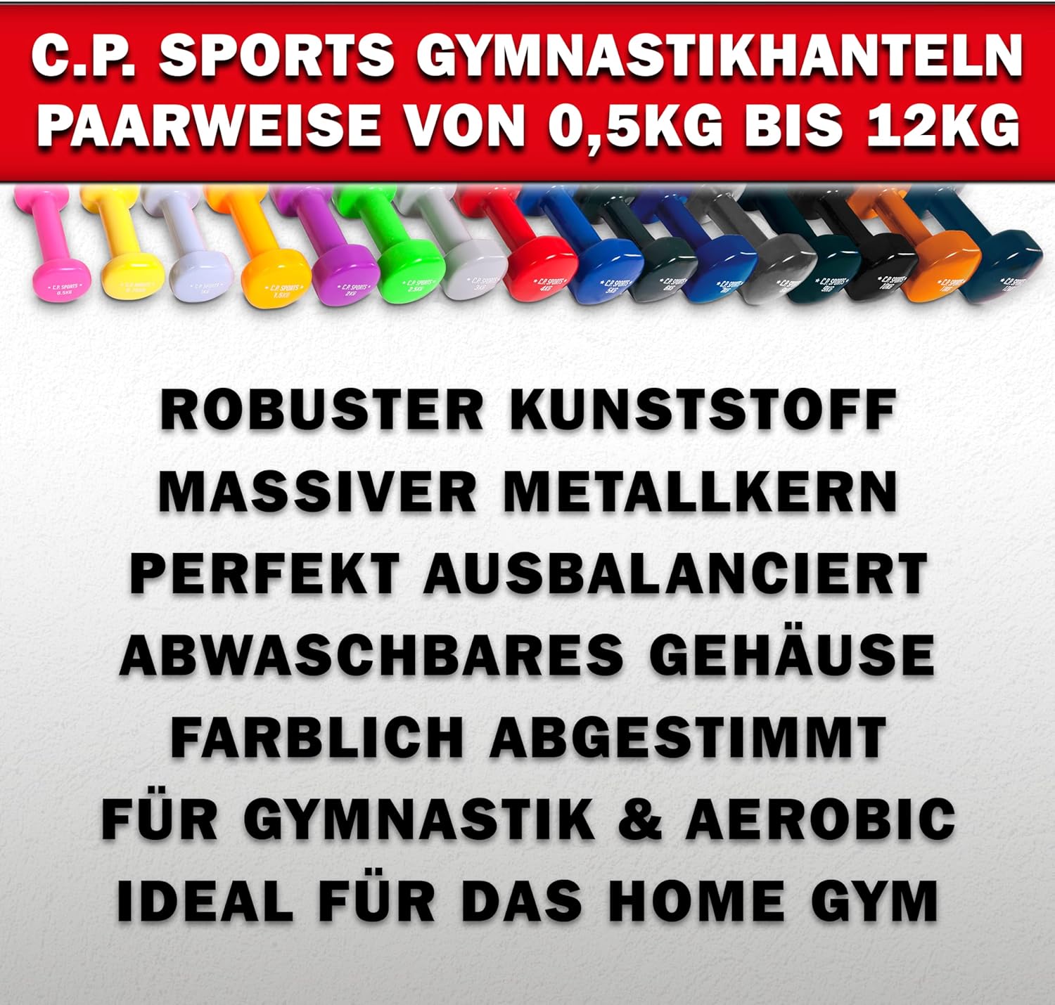 FITNESS LEVEL UP! C.P.Sports gymnastic dumbbells in pairs or sets – finely graduated in different weight sizes from 0.5kg to 12kg, each with individual stylized color – perfect for your personal training level and continuous increases in your performance – push your limits!