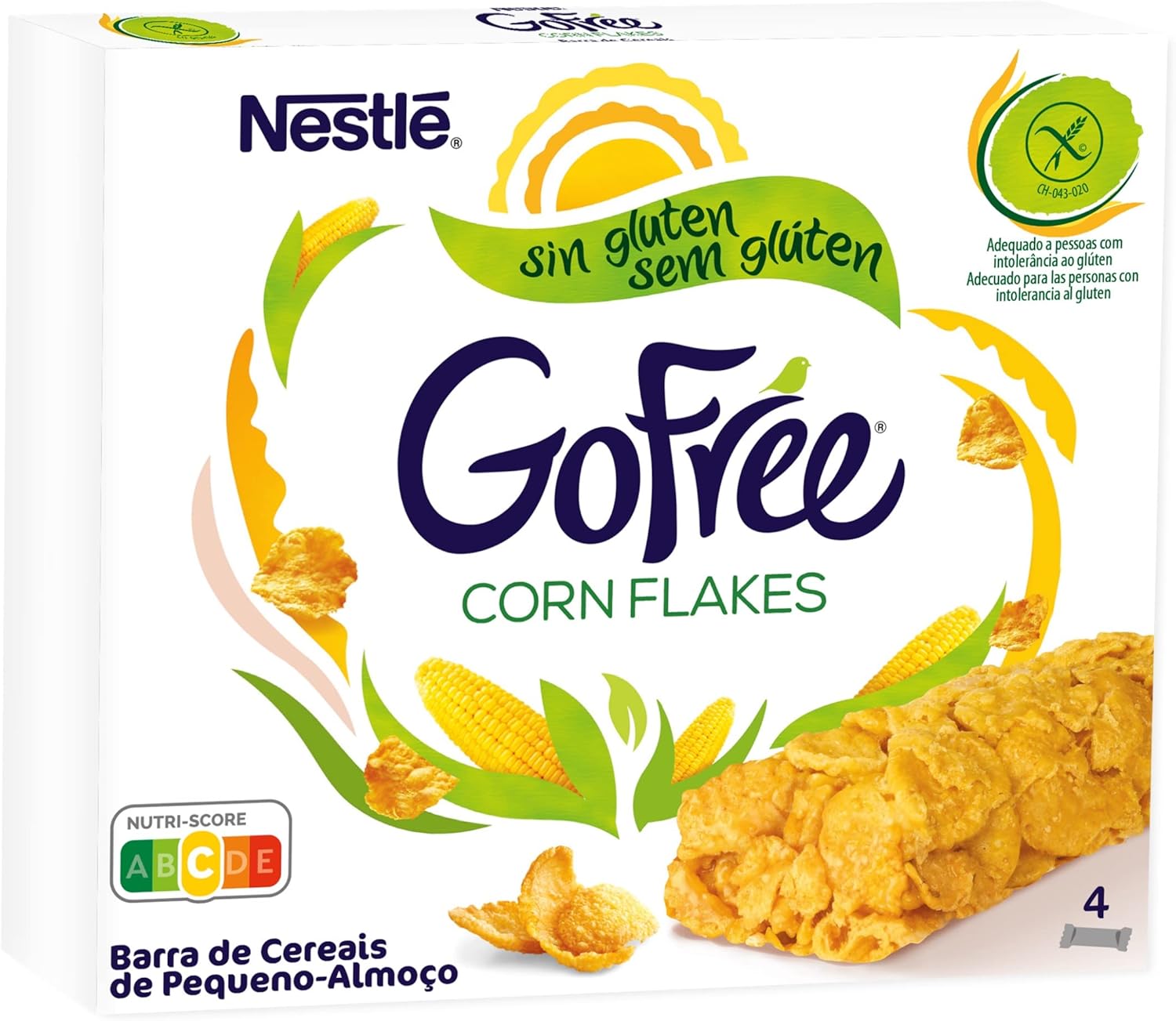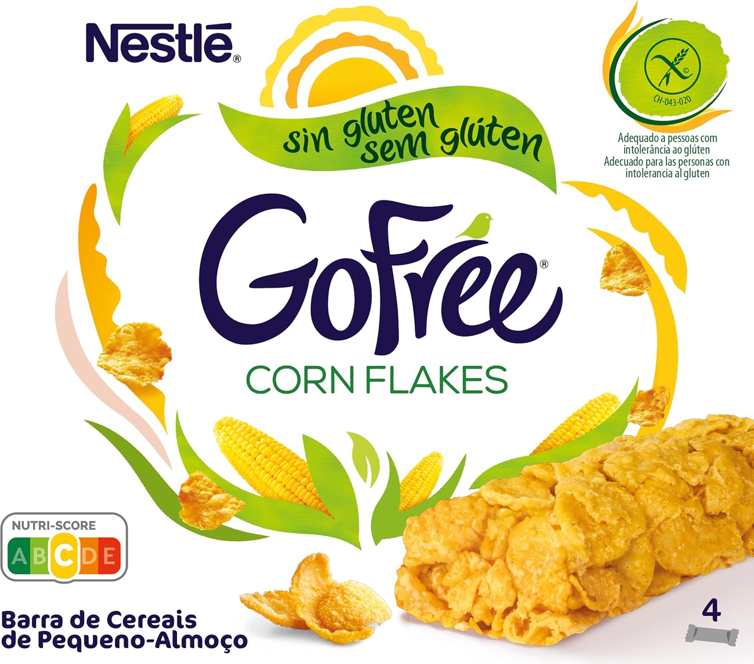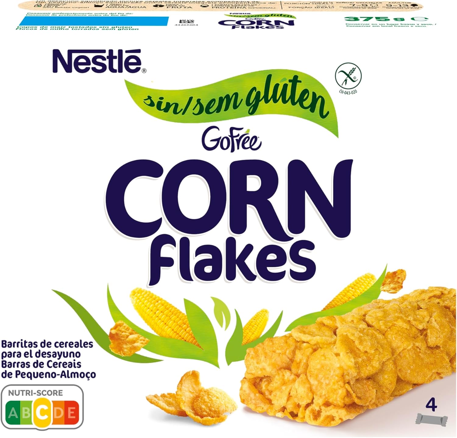 Corn flakes cereal bars; gluten free; enriched with B vitamins (B2, B3, B5 and B6) calcium and iron; delicious energy for an optimal start; Brand: Cereales Nestlé