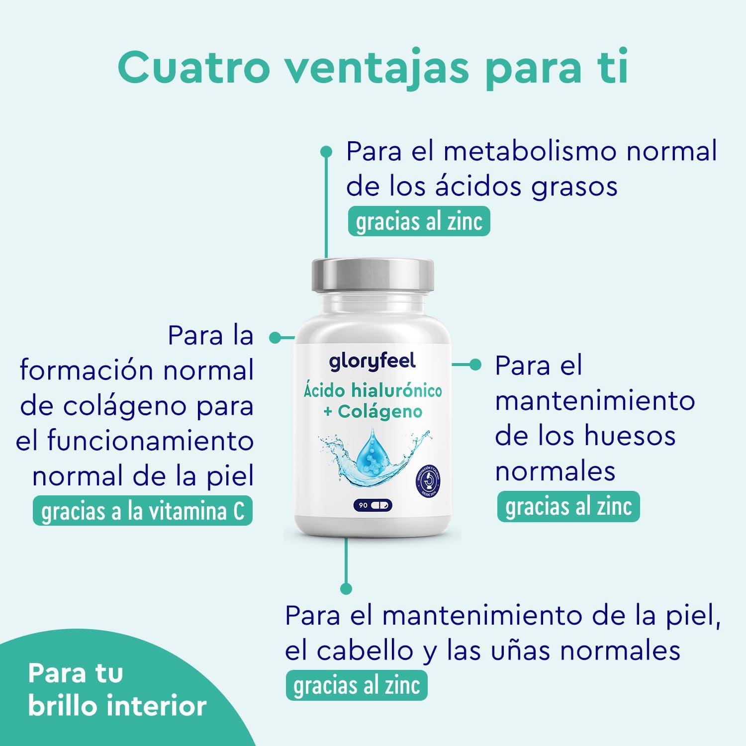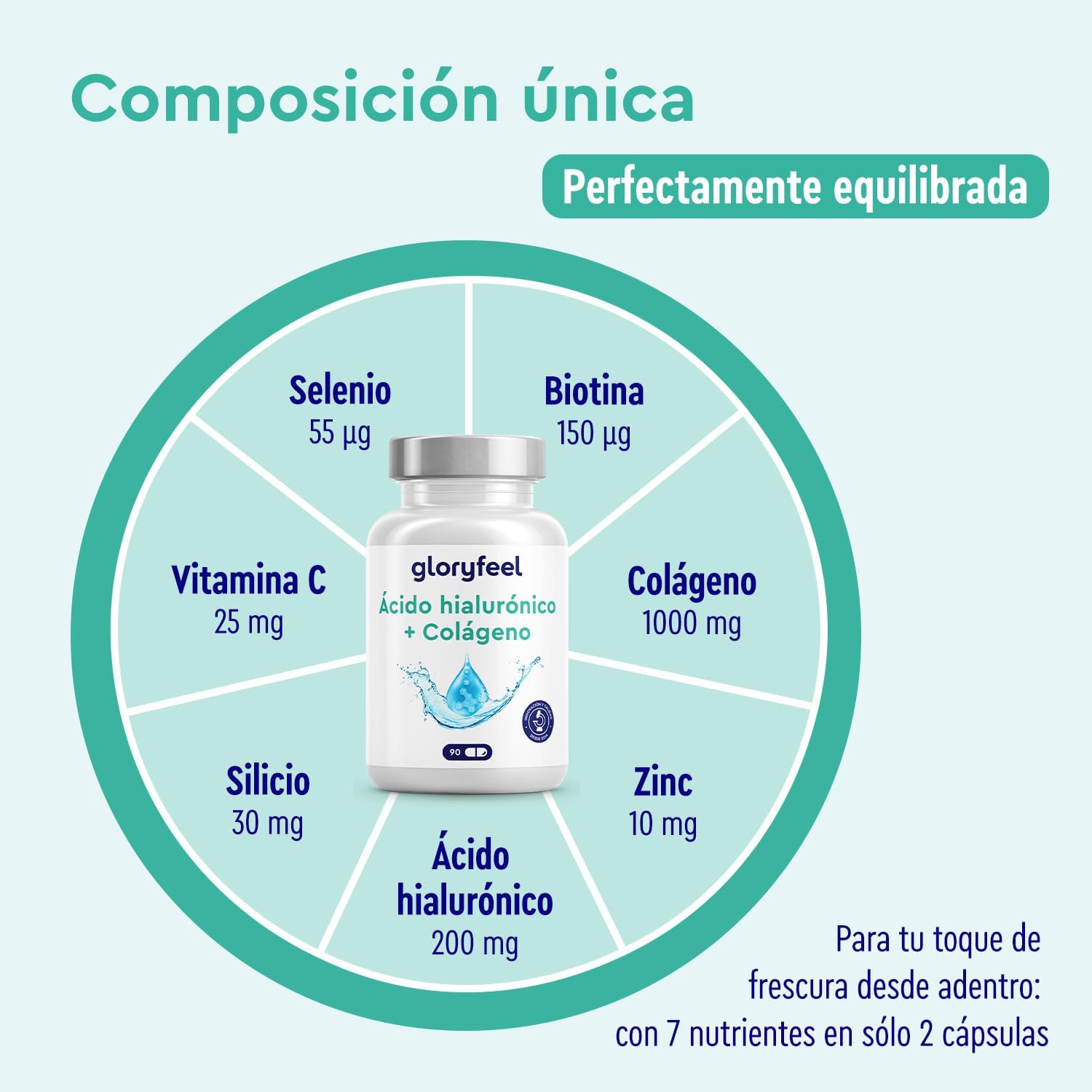 ✅ IDEAL COMBINATION: 7 NUTRIENTS IN ONE COMPLEMENT – Our Hyaluronic Acid + Collagen capsules offer you the optimal combination of essential vitamins and minerals for skin, hair, bones, joints and more*. Per daily dose you will get 1000mg of Collagen, 200mg of Hyaluronic Acid, Vitamin C from Acerola, Silicon, Zinc, Biotin and Selenium. For your touch of freshness from the inside with Hyaluronic Acid (500-800kDa) and Hydrolyzed Collagen Type 1 (95%) and Type 3.