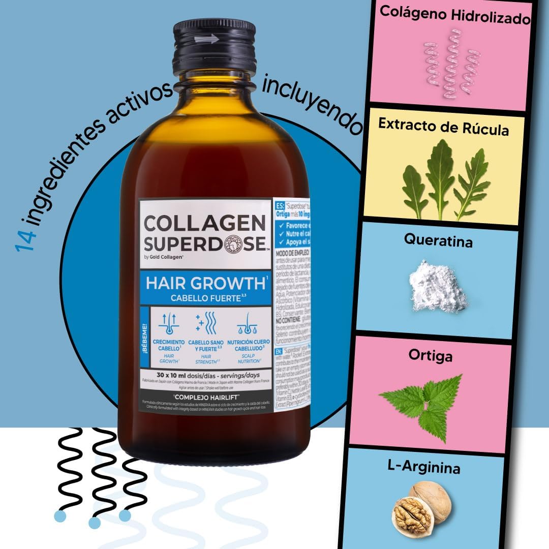 COLLAGEN SUPERDOSE BY GOLD COLLAGEN Strong Hair – Liquid Complement Hair Skin Nails with Hydrolyzed Marine Collagen, Vitamin C, Biotin, Zinc Selenium, Hair Loss and Growth, 300 ml