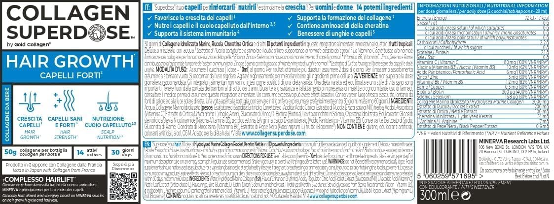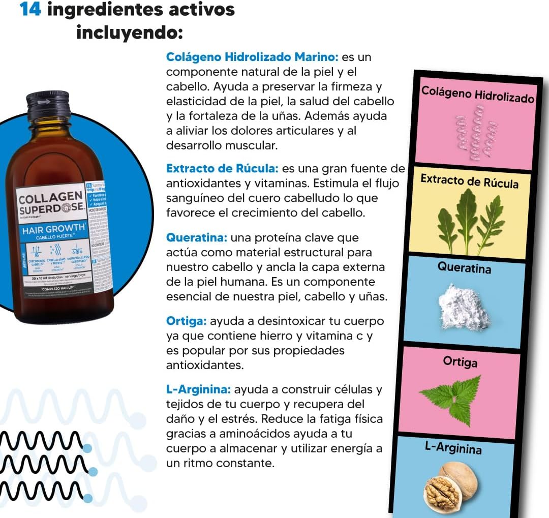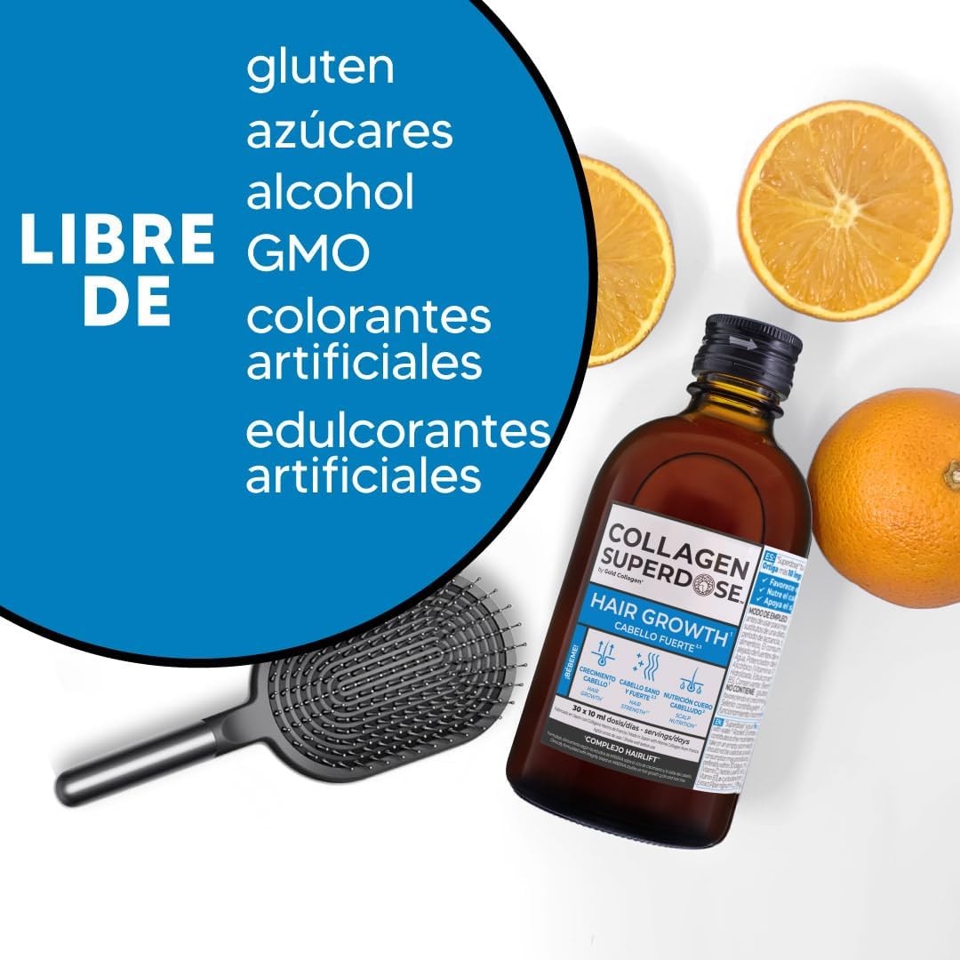 LIQUID COMPLEMENT FOR HAIR GROWTH: Thanks to its advanced formula, COLLAGEN SUPERDOSE Strong Hair promotes hair growth. It is advised to drink 1 or 2 spoons a day alone or mixed with water or juice, with a pleasant taste of tropical fruits