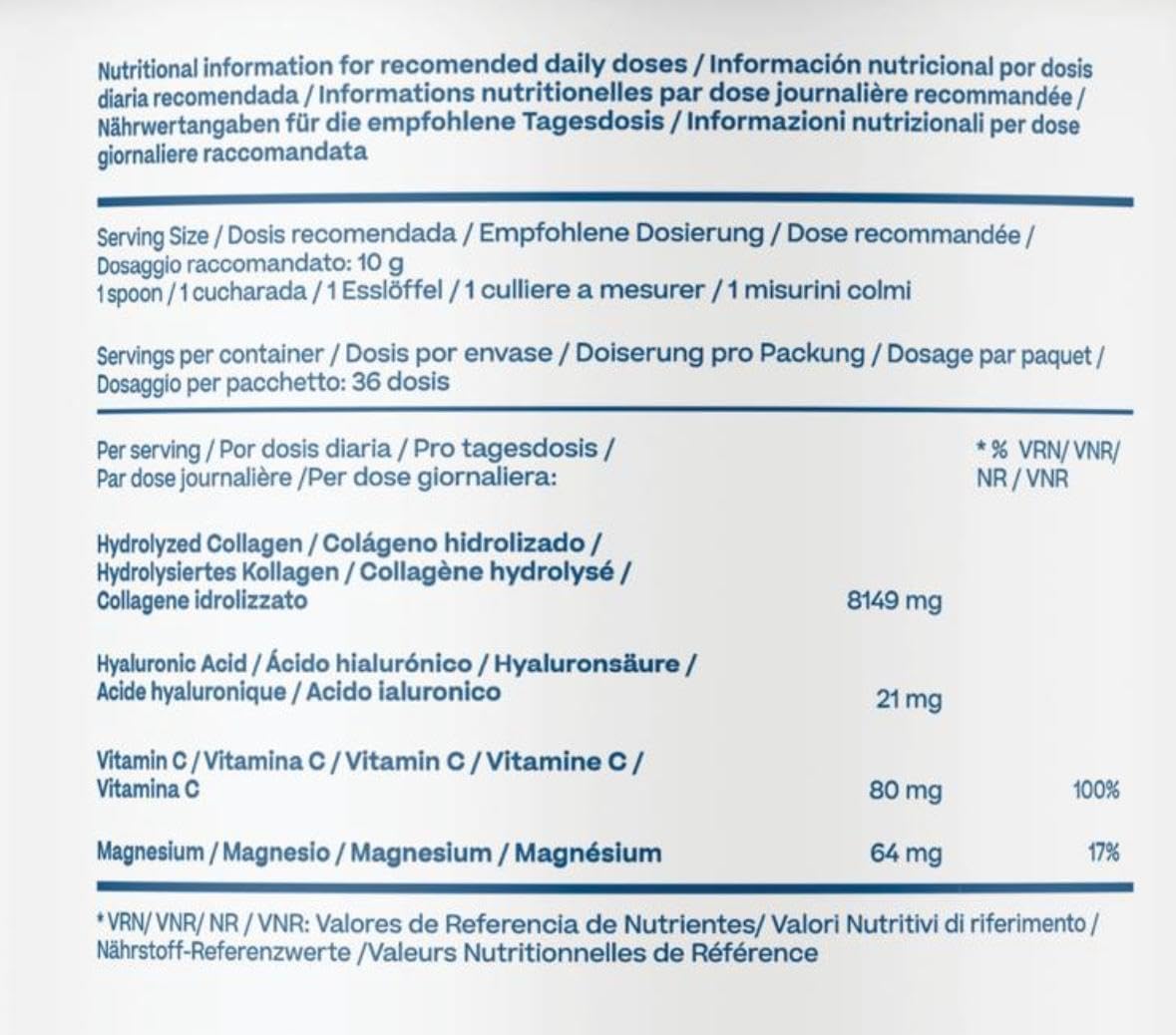 hydrolyzed bovine collagen, magnesium carbonate, acidulant (citric acid), antiglomerant (silicon dioxide), flavouring, calcium L-ascorbate (Vitamin C), sodium hyaluronate (hyaluronic acid), and sweeteners (sucralose and steviol glycosides).