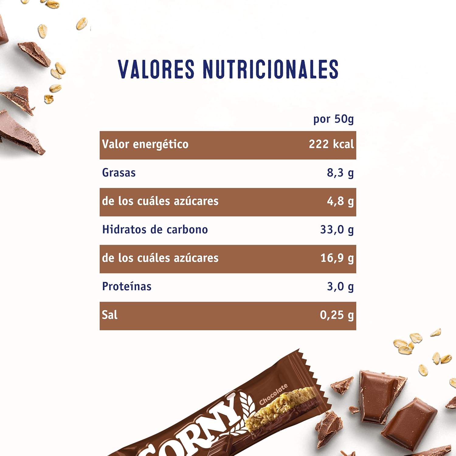 Corny Chocolate Cereal Bars are a delicious snack with an authentic and delicious flavor of melted chocolate and crunchy Peanuts, in a practical and easy to carry format.