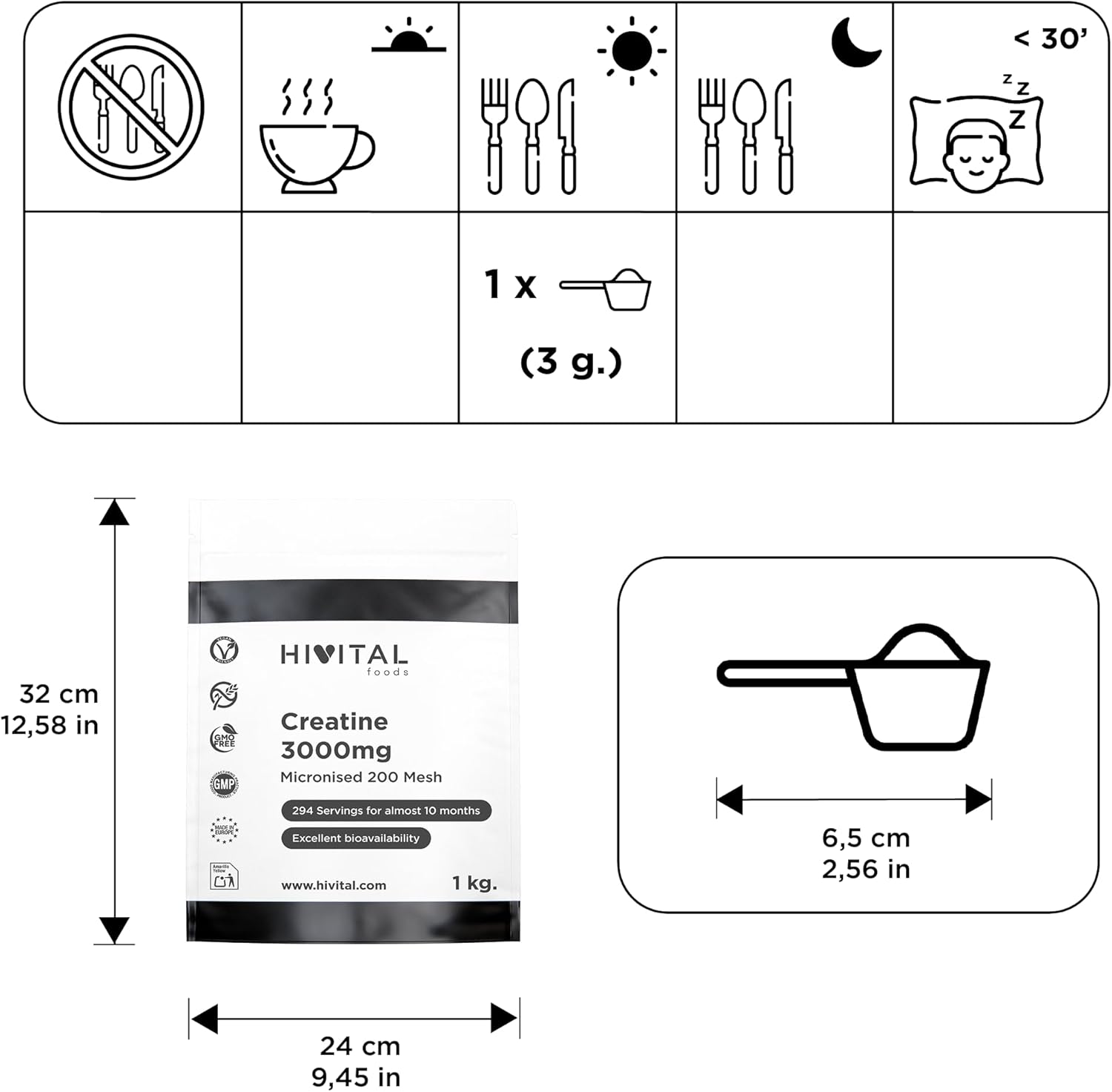 Creatina 3000 mg. 1 Kg / 1000 g. 294 raciones para casi 10 meses de tratamiento. Monohidrato de Creatina en polvo 100% Pura, Vegana y Micronizada a 200 Mesh. Fabricado en España por HIVITAL