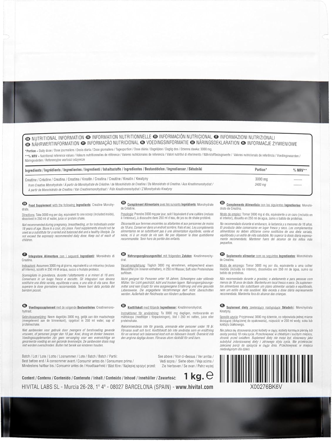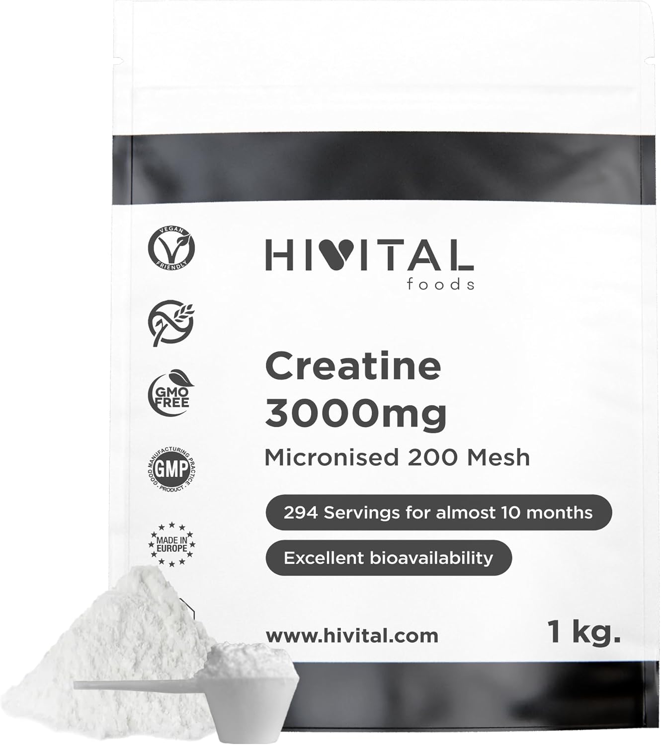 EXCELENTE FÓRMULA a base de Monohidrato de Creatina 100% pura, vegana y sin gluten. Sin sabor y sin edulcorantes ni colorantes.GRAN CANTIDAD DE PRODUCTO EN CADA ENVASE: Ofrecemos 1 kilogramo de polvo vegano por envase, para casi 10 meses de tratamiento (294 dosis de 3 gramos).LA MEJOR CREATINA: Cada dosis contiene 3000 mg de Creatina a partir de 3400 mg de Monohidrato de Creatina (al 88,24% en Creatina pura). Nuestra Creatina es Micronizada con factor de malla 200 (200 Mesh) para mejorar la solubilidad, absorción y eficacia. POSOLOGÍA: Tomar 3000 mg al día, equivalente a un cazo (incluido en el interior), disuelto en 250 ml de agua, zumo o batido de proteínas.NO UTILIZAMOS Estearato de Magnesio ni ningún tipo de Dióxido ni producto químico, aditivos poco recomendables muy utilizados en la mayoría de los complementos alimenticios de otras marcas.MÁXIMA CANTIDAD Y CALIDAD: Ofrecemos 1 kilogramo por pack para casi 10 meses de tratamiento (294 raciones). Producto 100% Vegano, Sin Gluten, Sin Lactosa, Sin Soja, Sin Estearato de Magnesio, Sin Dióxidos de ningún tipo, Sin Azúcar, Sin Edulcorantes, Sin Conservantes ni Colorantes, No transgénico (GMO Free).FABRICADO EN ESPAÑA bajo certificados GMP e ISO. Hivital Foods está registrada en AESAN con número 26.019181B.100% SATISFACCIÓN TOTAL ¡Si no quedas completamente satisfecho, te devolvemos tu dinero!EBOOK DE REGALO: Al comprar nuestro producto, solicítanos nuestro ebook (en pdf) sobre la Creatina y te lo enviaremos. Conocerás en detalle todas sus propiedades y beneficios para tu salud.