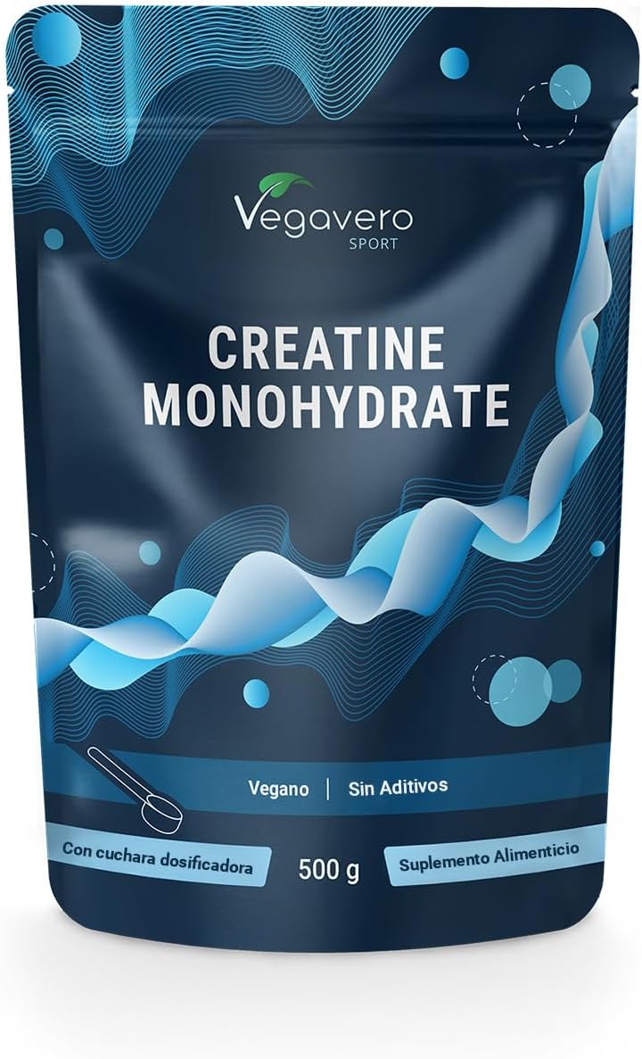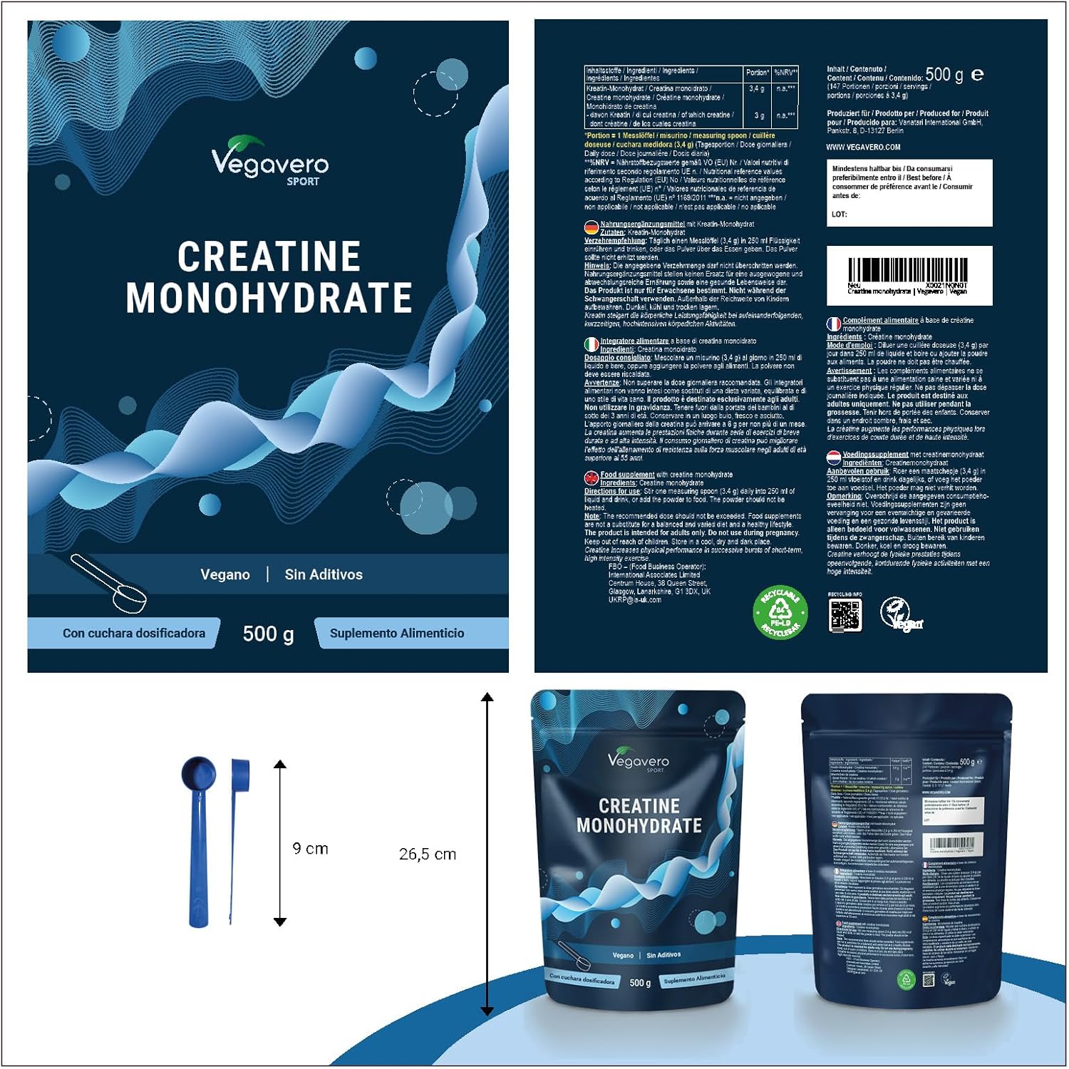 Monohidrato de creatina puroBolsa de 500 g con cierreIngesta recomendada: 1 cacito (=3,4 g) al díaVeganoFabricado en AlemaniaProbado en laboratorioSin aditivos sintéticos como el estearato de magnesio, sin ingeniería genéticaFabricado según las normas HACCP