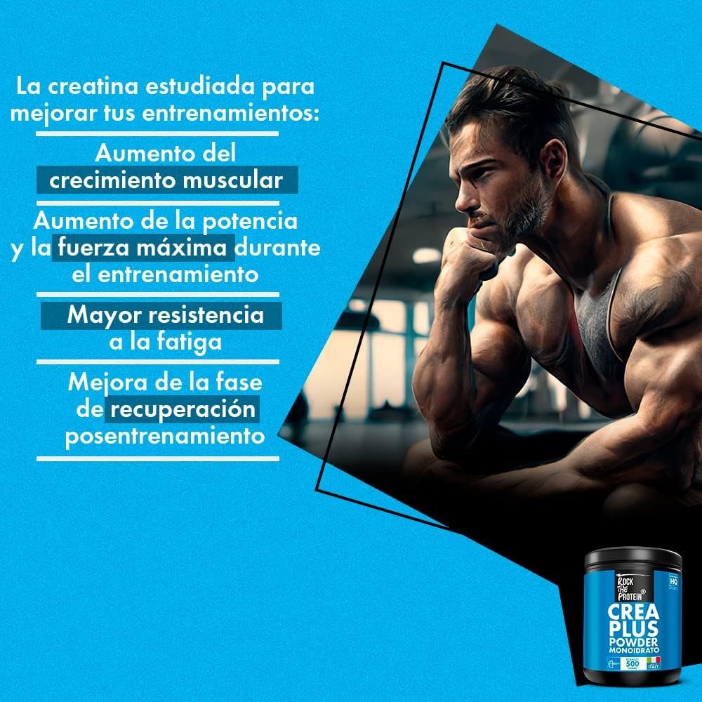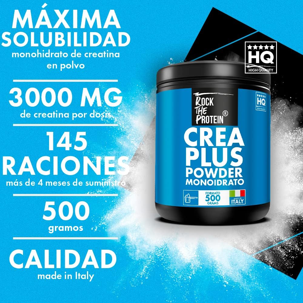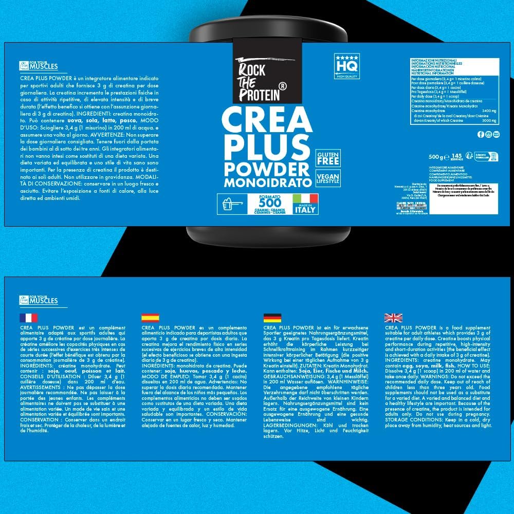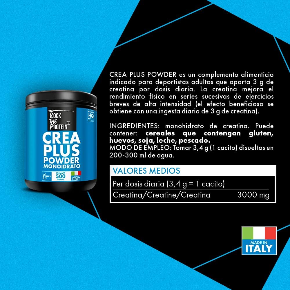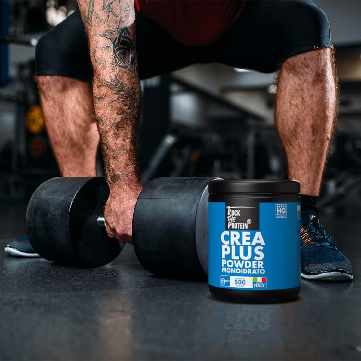 💪 Creatine Monohydrate Powder – Crea Plus Rock The Protein aims to support your athletic performance and muscle growth. Pure creatine monohydrate, precursor to the main form of energy used by cells (ATP), is able to release energy at times of maximum metabolic demand, increasing peak potency and reducing the feeling of fatigue