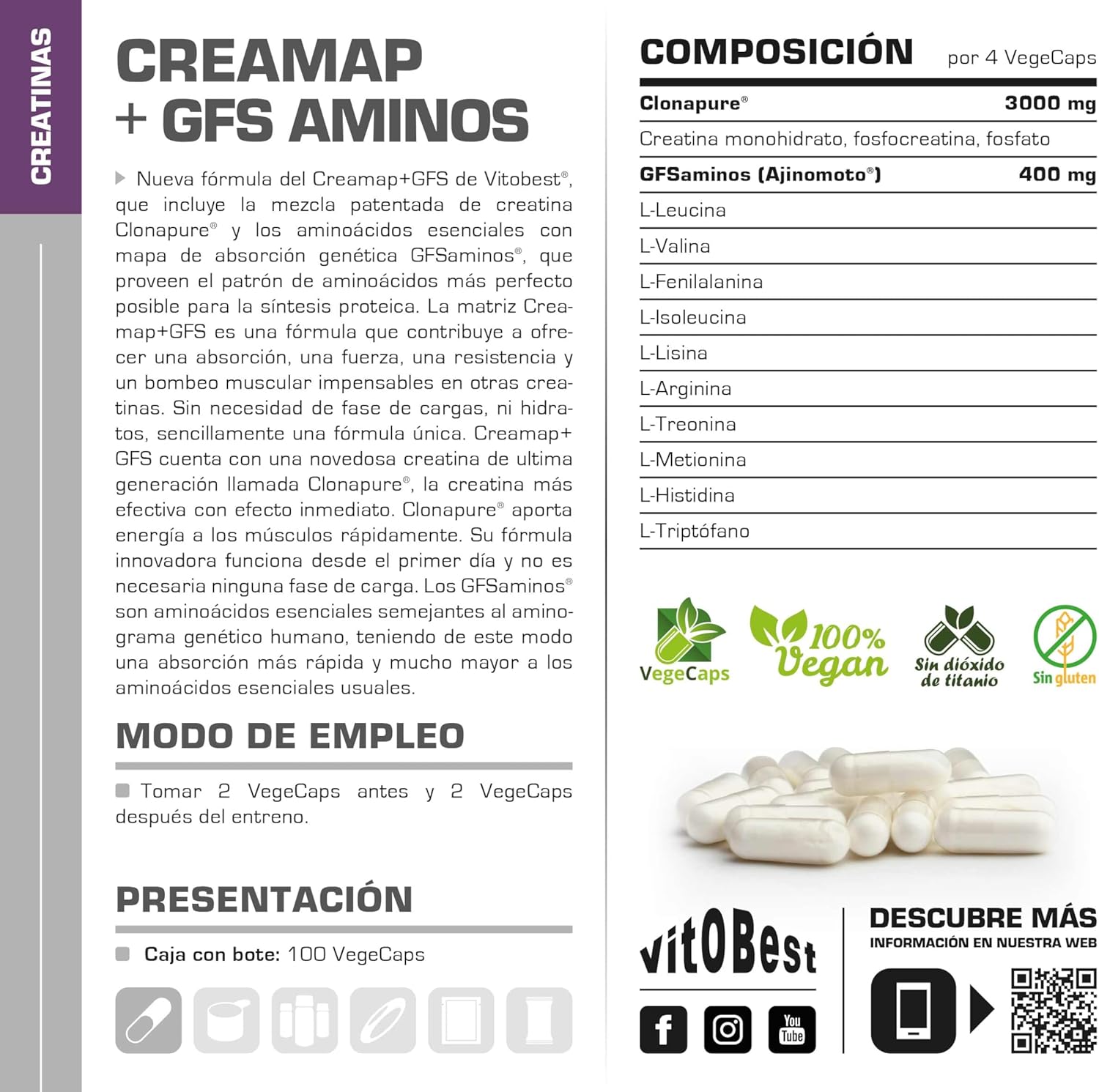 ✅ Vitobest’s new Creamap+GFS formula, which includes the proprietary creatine blend Creatine Magna Power, Kre-Alkalyn and Crea-trona plus the Essential Amino Acids with GFSaminos genetic absorption map, which provide the most perfect amino acid pattern possible for protein synthesis.