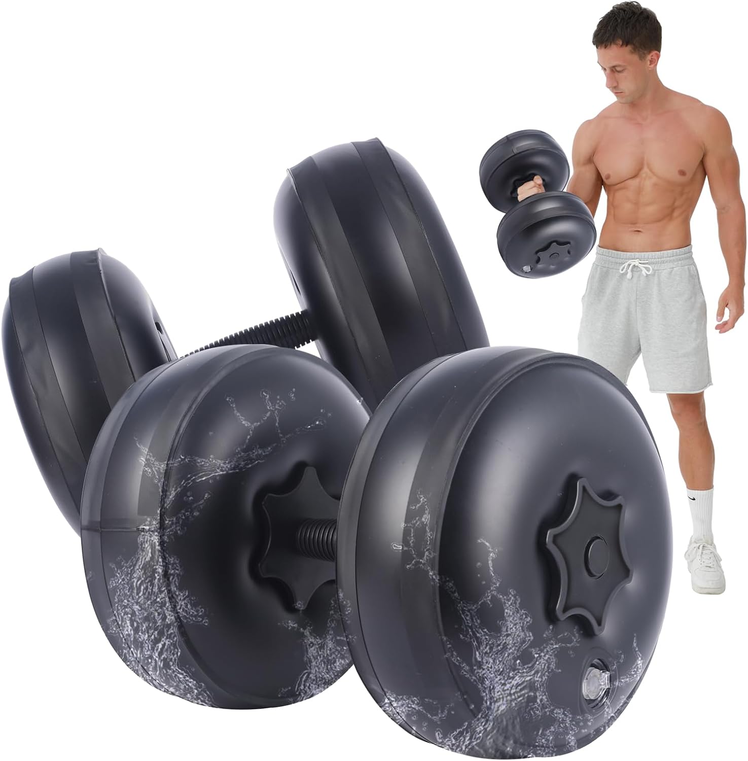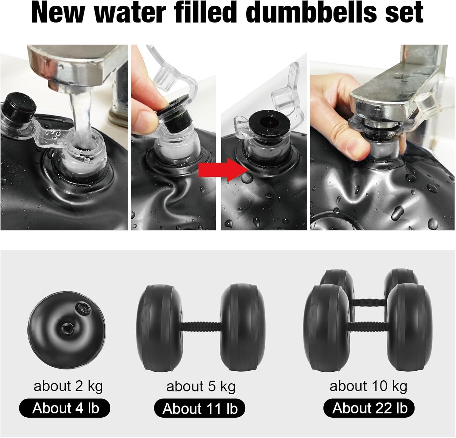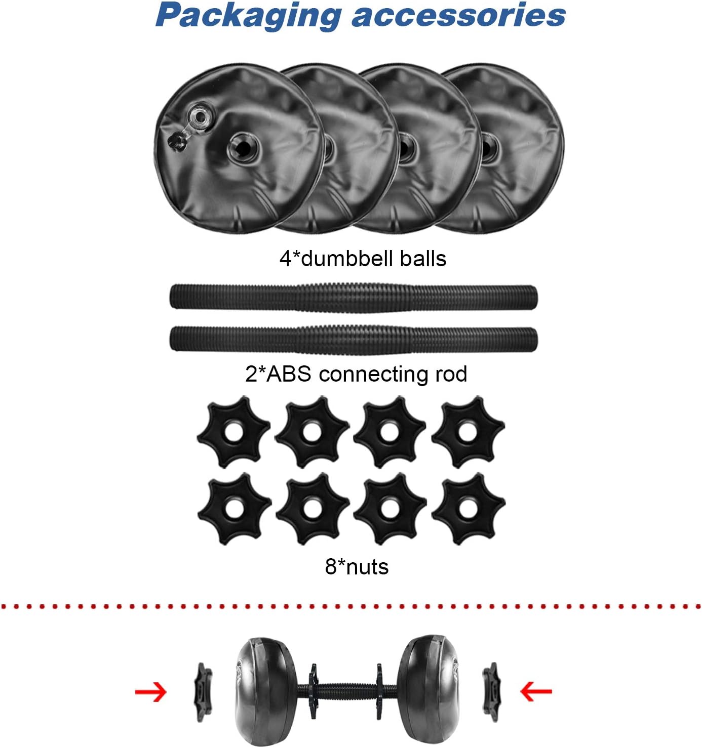 💪【Water Filled Dumbbell Set for Travel】 Dumbbells are injected with water and can be used when filled with water. Easily adjust the weight of the dumbbell or dumbbell set from 1 to 10 kg. ★Package Included: 4 x Dumbbell Balls, 2 x Barbell Posts, 8 x Bar Clamps