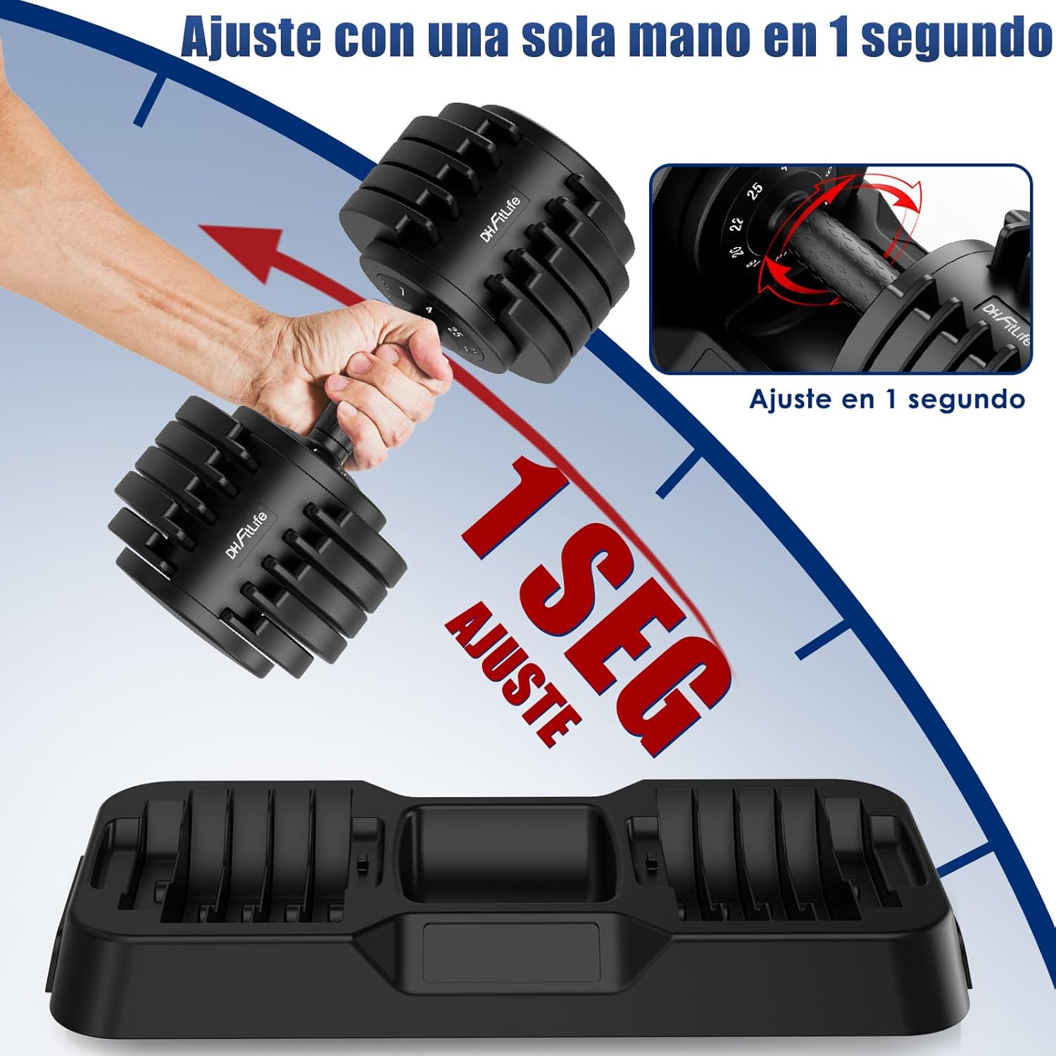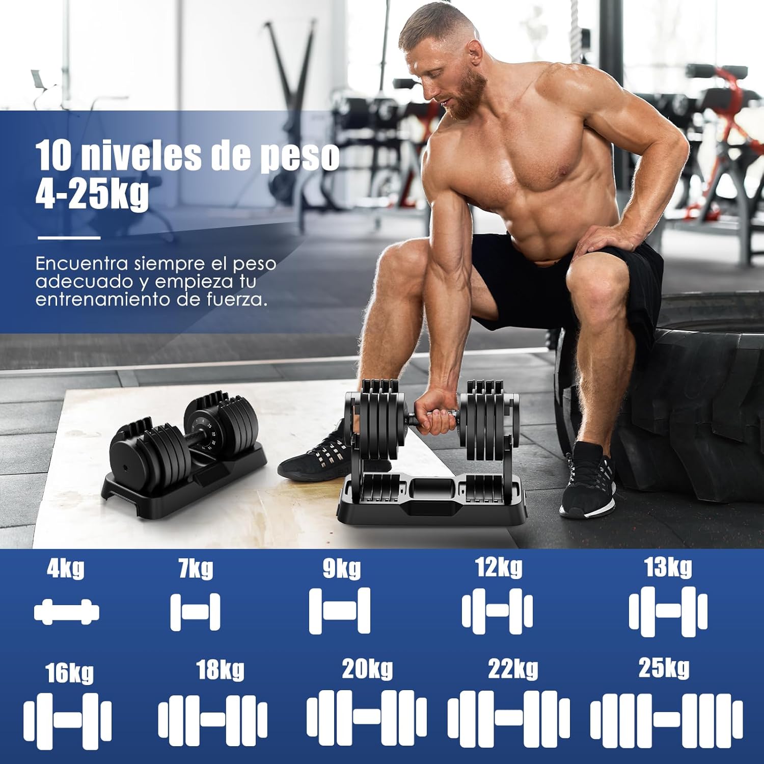 Quick Weight Adjustment: Just with a simple gesture, you can adjust the weight of our adjustable dumbbell from 4kg to 24kg in 10 levels, allowing you to adapt to each exercise and optimize your performance in just a few seconds. EUIPO and ROHS certified for quality and safety. Ideal for beginners starting their training and professionals looking for efficient performance.