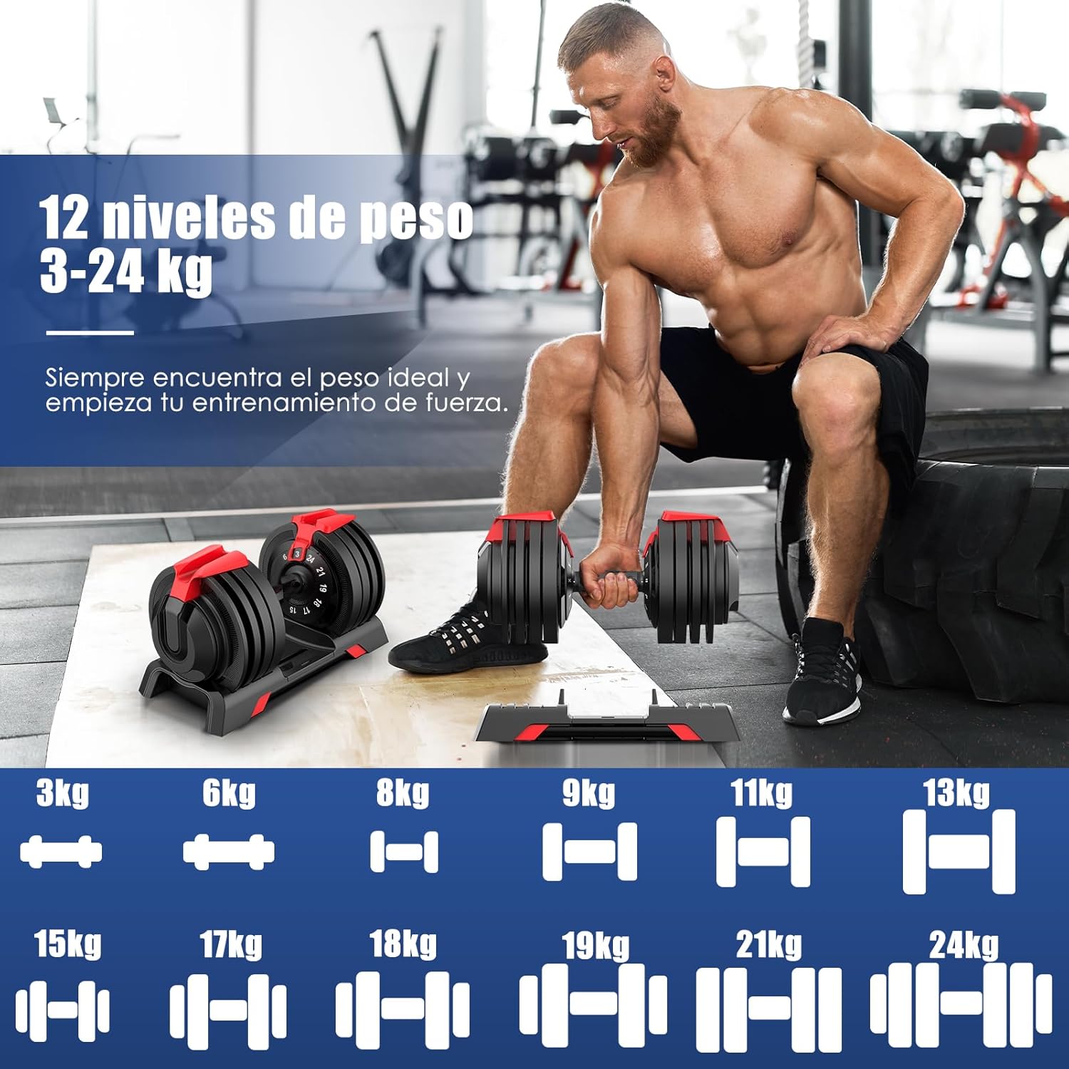 WEIGHT ADJUSTMENT IN SECONDS: This innovative adjustable dumbbell offers 12 weight levels, allowing strength workouts from 3kg to 24kg, perfect for your home gym. Individual weight adjustment can be done in seconds with just one hand. The product has EUIPO and ROHS certifications, and is suitable for both beginners and professionals. Changing weight for different exercises can be done at any time during training.