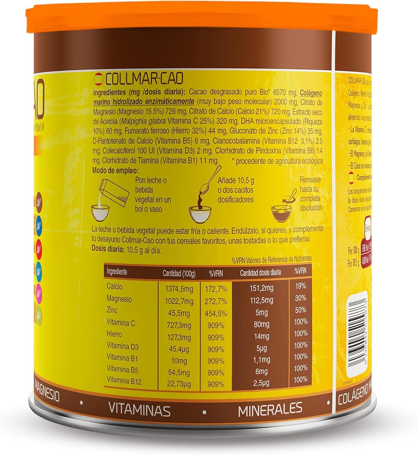 WHAT IS COLLMAR CAO? Food supplement with organic defatted cocoa, Hydrolyzed Marine Collagen, DHA, Vitamins C, D, B1, B5, B6 and B12 and minerals such as Iron, Magnesium and Zinc. The perfect combination for a full and nutritious breakfast!