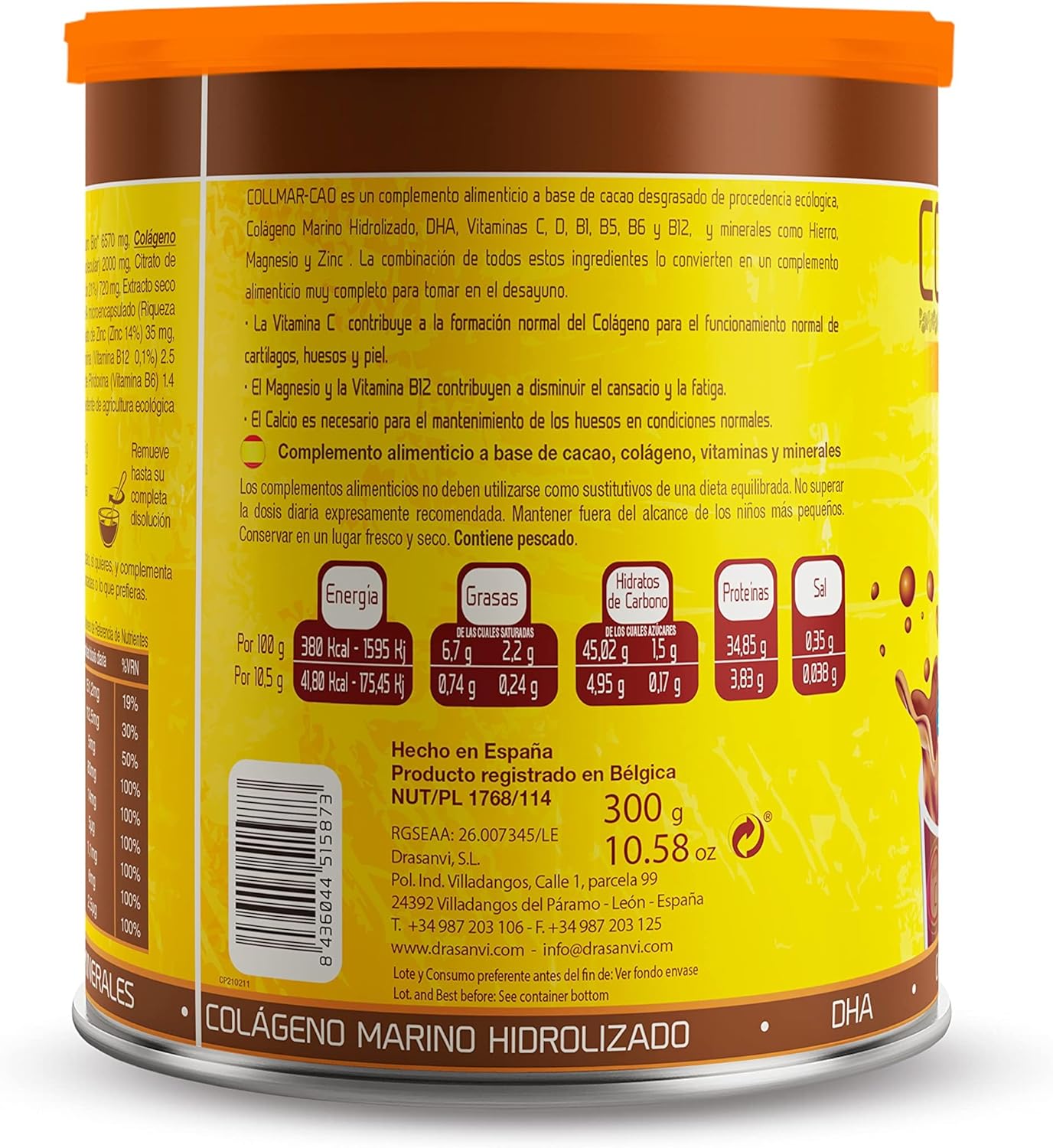 Collmar Cao is a revolutionary food supplement, designed to transform your breakfasts into a nutritious and delicious experience. Combines organic defatted cocoa with a rich blend of hydrolyzed marine collagen, DHA, vitamins C, D, B1, B5, B6 and B12, and essential minerals such as iron, magnesium and zinc. The synergy of these ingredients makes Collmar Cao the perfect ally to start the day with energy and vitality. The proteins present in Collmar Cao contribute significantly to the increase in muscle mass. Vitamin C is crucial for normal collagen formation, essential for healthy functioning of cartilage, bones and skin. Vitamin B2 contributes to the normal metabolism of iron, ensuring proper distribution of this essential mineral in the body. Vitamin B6 is vital for normal protein and glycogen metabolism, helping to maintain optimal energy levels. Vitamin D plays a crucial role in the normal absorption and utilization of calcium and phosphorus, essential for maintaining strong and healthy bones. Magnesium and vitamin B12 help decrease tiredness and fatigue, providing a feeling of vitality and well-being throughout the day. Calcium is necessary for the maintenance of bones under normal conditions, while zinc contributes to normal protein synthesis, supporting tissue regeneration and growth. The marine collagen used in Collmar Cao comes from fish. A recent study has shown that marine collagen is more easily assimilated than other collagen sources, such as porcine. Collmar marine collagen has undergone a unique process of enzymatic hydrolysis, which involves fragmenting collagen into smaller molecules, called peptides, so that they are more easily assimilated by the body. The cocoa that has been used in its composition is of maximum quality, since it is defatted and is of biological origin, thus guaranteeing a healthy and sustainable product. Collmar Cao presents in its composition vitamins C, D, B1, B5, B6 and B12; and minerals, iron, magnesium and zinc, getting a very beneficial food supplement to endure the morning. Drasanvi has chosen to incorporate vitamin C through acerola, a fruit that naturally presents a large amount of this vitamin. Collmar Cao will accompany you every morning, providing the necessary nutrients to start your day. ECOSANA invites you to take care of yourself from the inside out. It is a delicious and healthy choice to enrich your daily diet. Its anti-inflammatory and cardiovascular properties make it an ideal complement to a balanced lifestyle. To preserve its nutritional properties, avoid using it in high temperatures. Choose to enjoy it in its natural state, adding it to your dishes after cooking. In this way, you will not only keep its taste and aroma intact, but also its benefits for your health and well-being