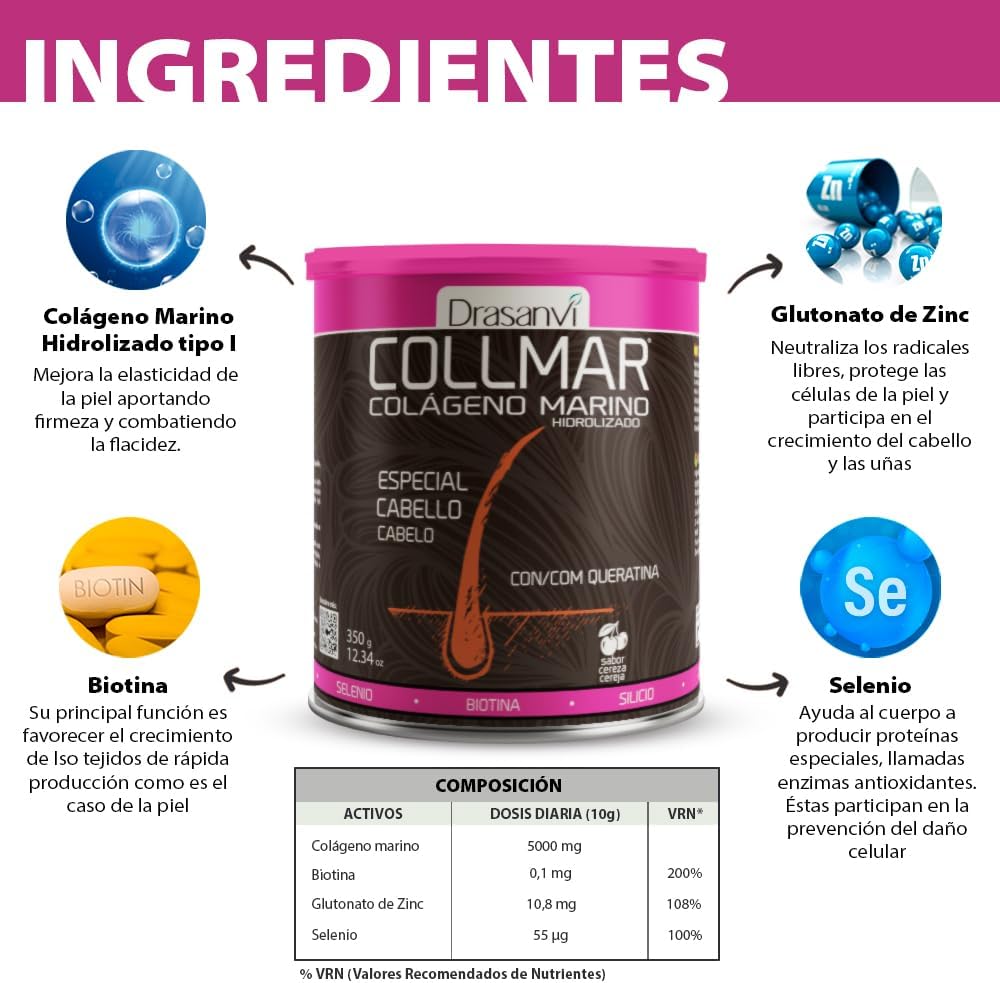 Drasanvi COLLMAR Hydrolyzed Marine Collagen + Biotin, Keratin, Selenium, Zinc and Bamboo Extract | Weak and Fine Hair | High Dose 5,000 mg/day | 350g Powder = 35 Days | Cherry Flavor