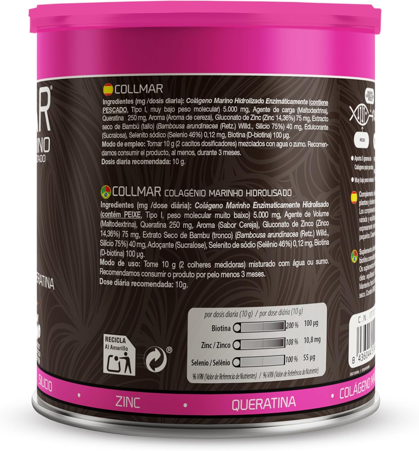 Collmar special Cabello is a food supplement that bases its action on the synergy of two of its main ingredients: enzymatically hydrolyzed marine collagen and keratin. These are two proteins that are naturally found in hair. In addition, this supplement is reinforced with Biotin and Zinc, which contribute to the maintenance of the hair under normal conditions. It uses standardized extracts, which means that the plants used always provide a known and constant amount of silicon.