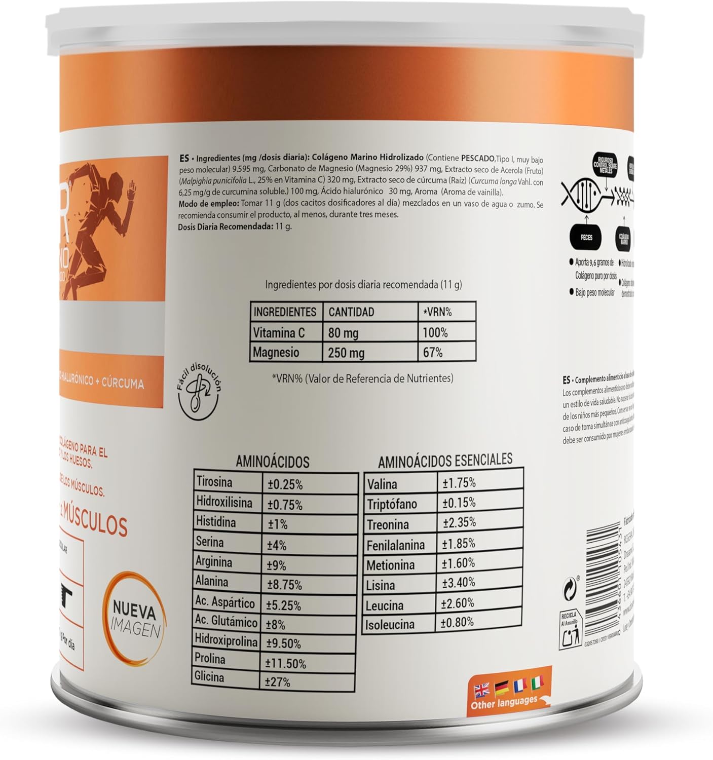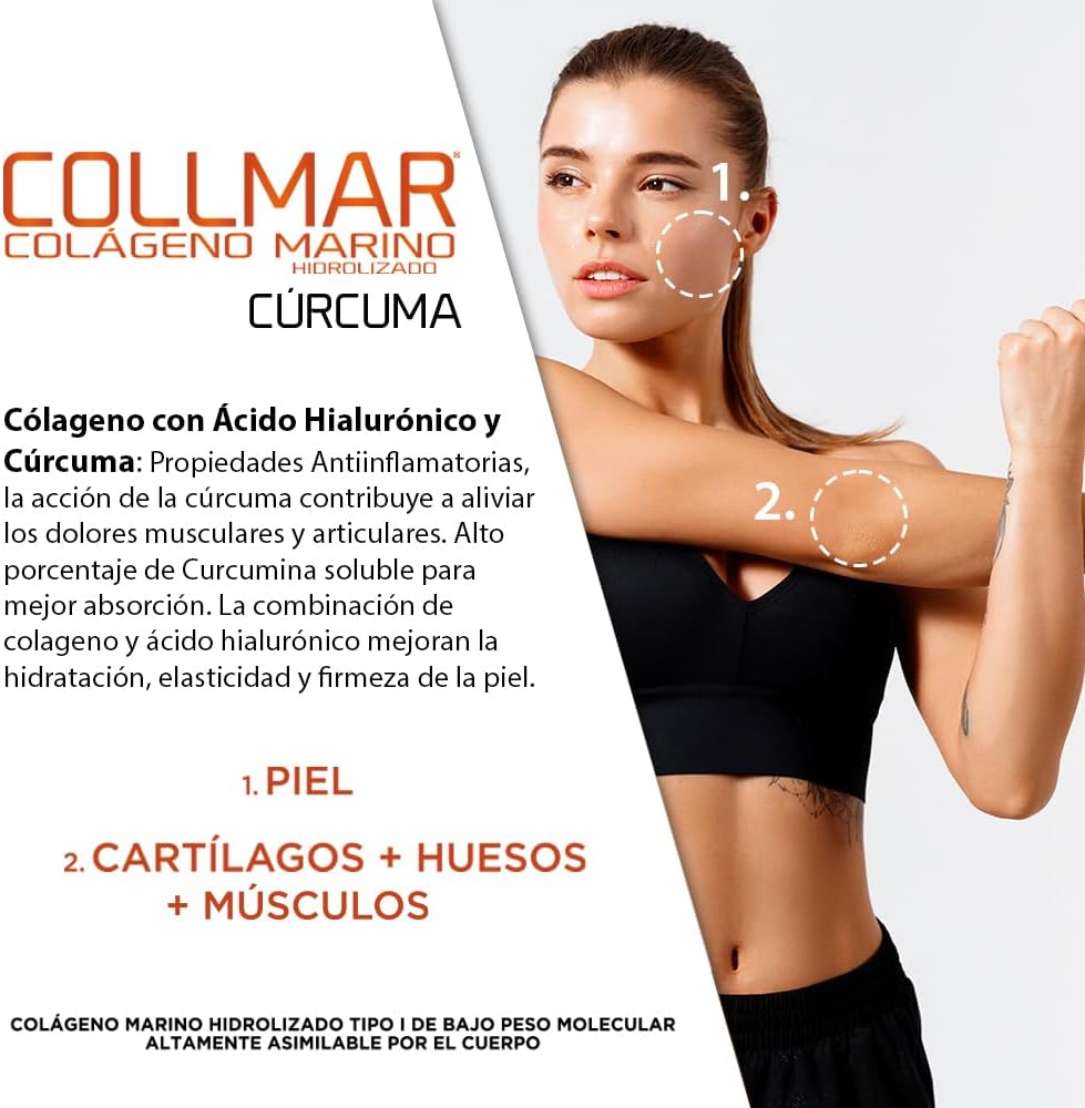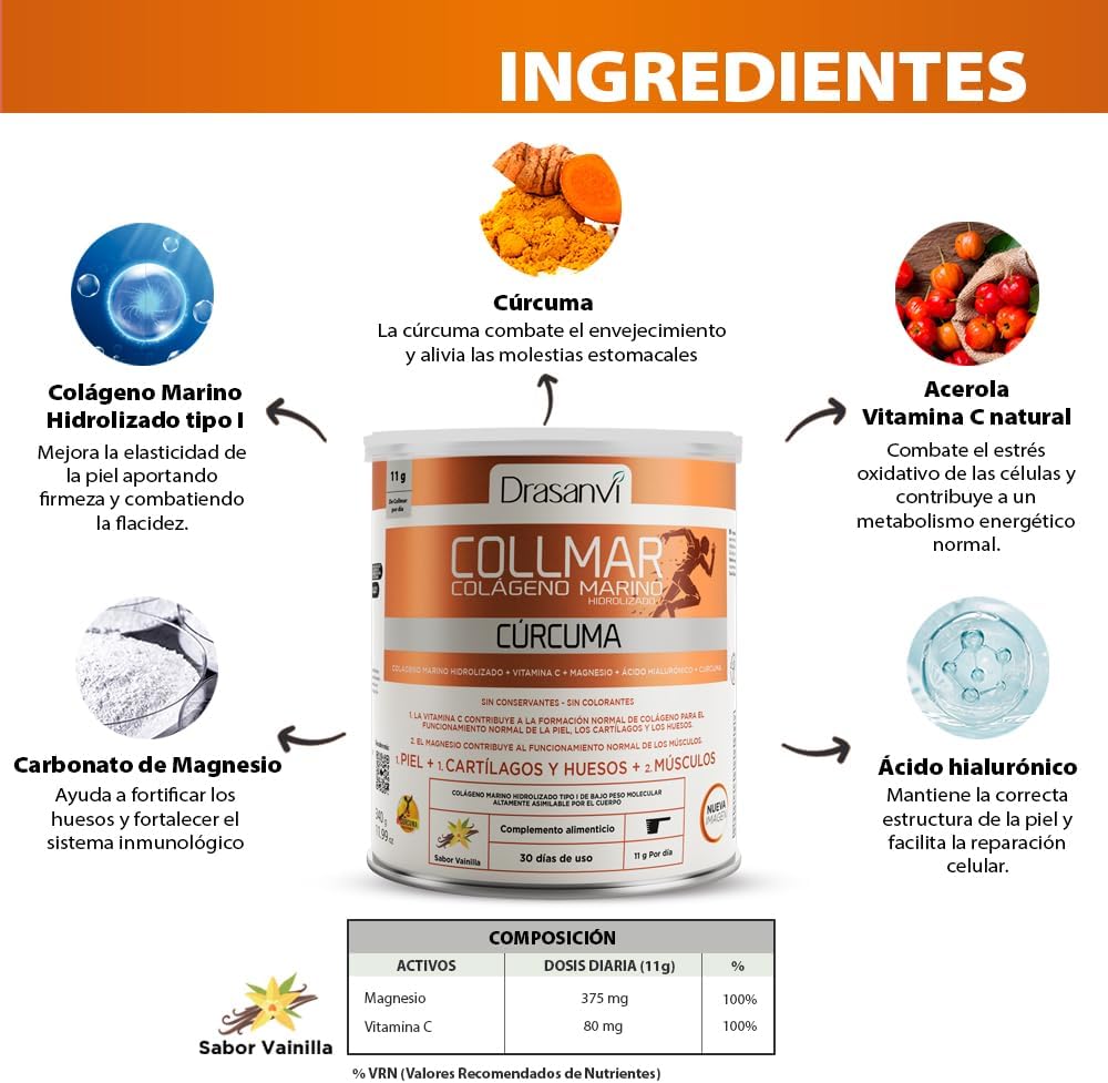 How to take COLLMAR MARINE COLLAGEN WITH VANILLA CURCUM: In powder format, take 11 g = two dosing scoops a day, mixed in a glass of water or juice. Easy dissolution and pleasant taste. Sugar Free