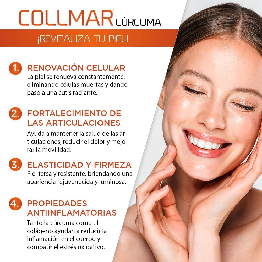 COMPLETE COLLAGEN FORMULA WITH HYALURONIC ACID AND CURCUMA: With anti-inflammatory properties, the action of turmeric contributes to relieve muscle and joint pain. High percentage of soluble Curcumin for better absorption. The combination of collagen and hyaluronic acid helps to enhance its beneficial effects, as they work together to improve the hydration, elasticity and firmness of the skin, attenuating the signs of aging, achieving supple skin
