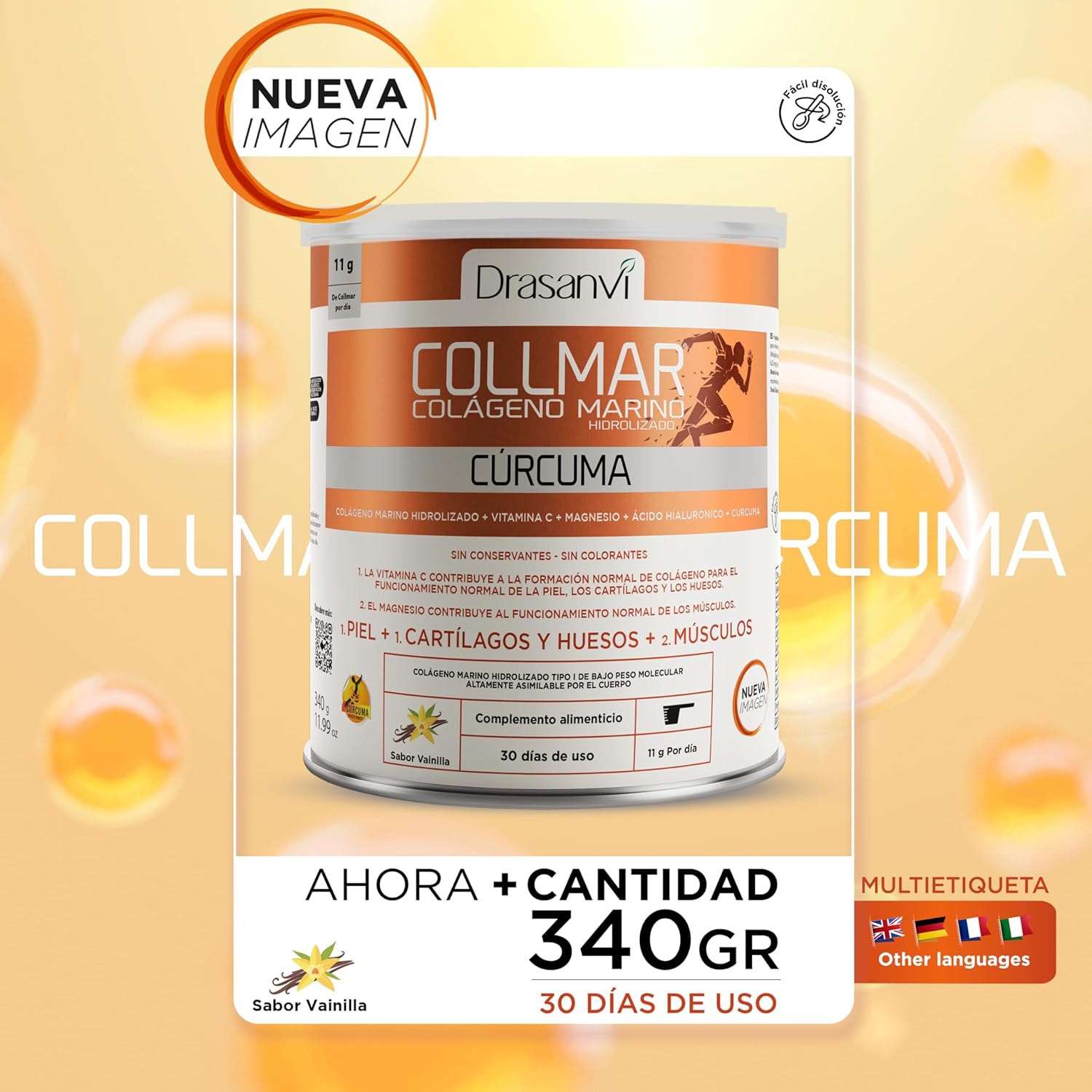 DRASANVI COLLMAR Hydrolyzed Marine Collagen + Curcuma with Magnesium, Vitamin C, Hyaluronic Acid | Joints and Muscles | Max Assimilation 9,595 mg/day | 340 g Powder | Collagen Vanilla Flavor
