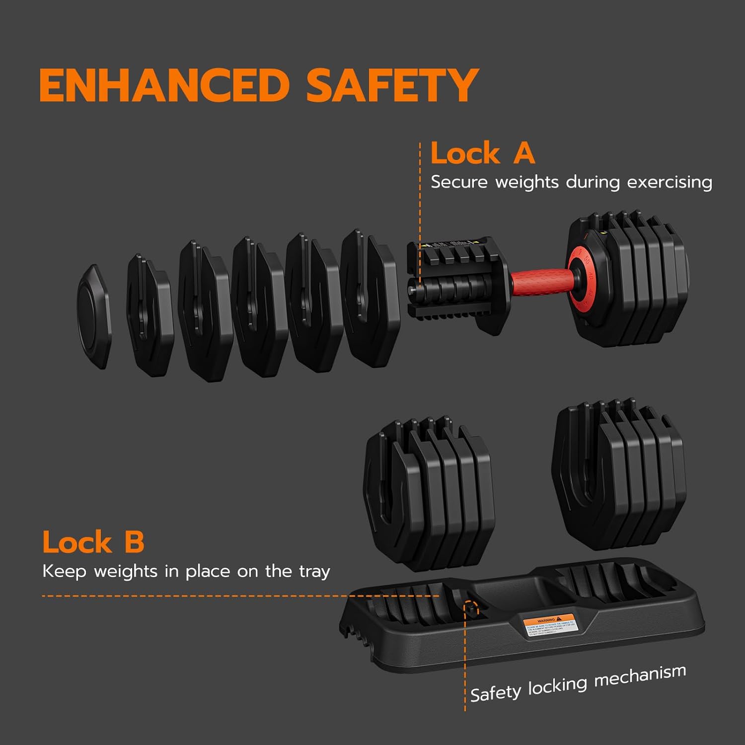【1 SECOND ADJUSTMENT】The design makes daily workouts easier. Simply twist the handles while the dumbbells are on the tray to increase or decrease weight quickly and enjoy faster, smoother adjustments for a more efficient workout. Attention: please make sure you hear the “click” sound before lifting the handle to prevent the plate from falling off.