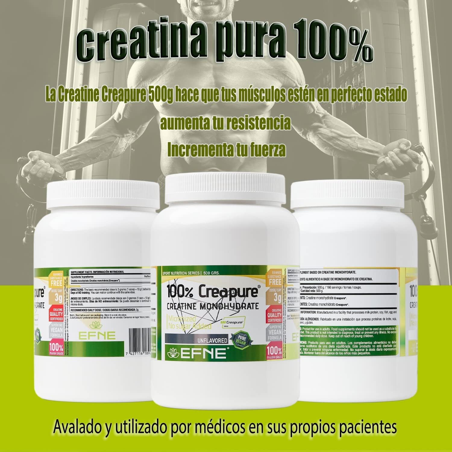 ✅ EFNE Creatine Creapure 100% : INCREASE YOUR STRENGTH: Increases endurance and strength up to 15% in sports such as weightlifting or others that need a big explosiveness. The improvement reaches up to 30% in increased power and energy release in short runs and up to 15% in repeated sprints training.