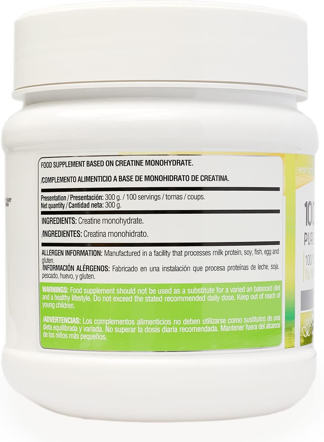-Each bottle contains 300g of pure creatine monohydrate powder. -Our Creatine 100% Monohydrate with a special micronization of 100-120 MESH that guarantees optimal intestinal absorption. -For an ideal creatine cure we recommend 5 grams of creatine monohydrate daily. -A daily serving of 5 grams of creatine monohydrate contains 4.5 grams of pure creatine. -Our pure creatine has a perfect solubility. – The included spoon allows for easy and precise dosing. -Creatine can be perfectly combined with other amino acids such as L-Citruline, L-Glutamine, Taurine, L-Tyrosine, L-Arginine and AAKG. -100% vegan powder. -Tested in independent laboratories to detect impurities and contaminants such as heavy metals, mold, E. coli, Salmonella and other relevant testing criteria. -Does not contain silicon dioxide or titanium.