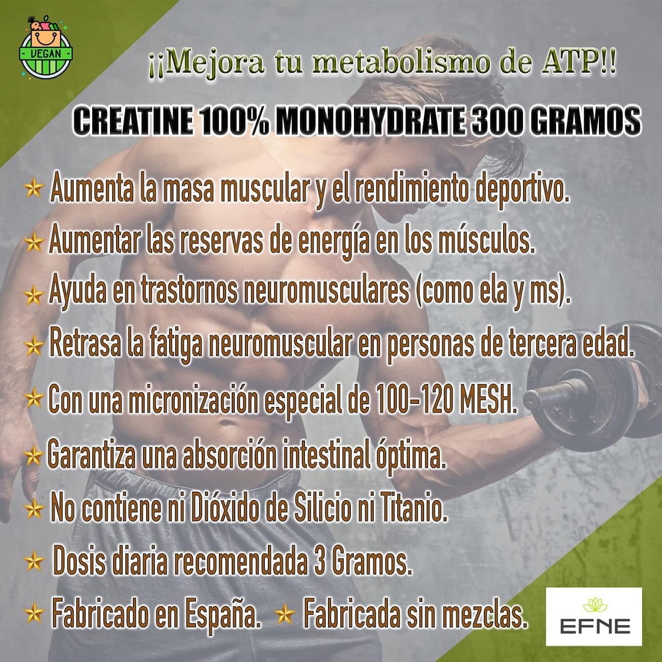 ✅ EFNE Creatine Monohydrate 100% 100/120 Mesh : INCREASE YOUR STRENGTH: Increases endurance and strength up to 15% in sports such as weightlifting or others that need a large explosiveness. The improvement reaches up to 30% in increased power and energy release in short runs and up to 15% in ss training repeated prints.