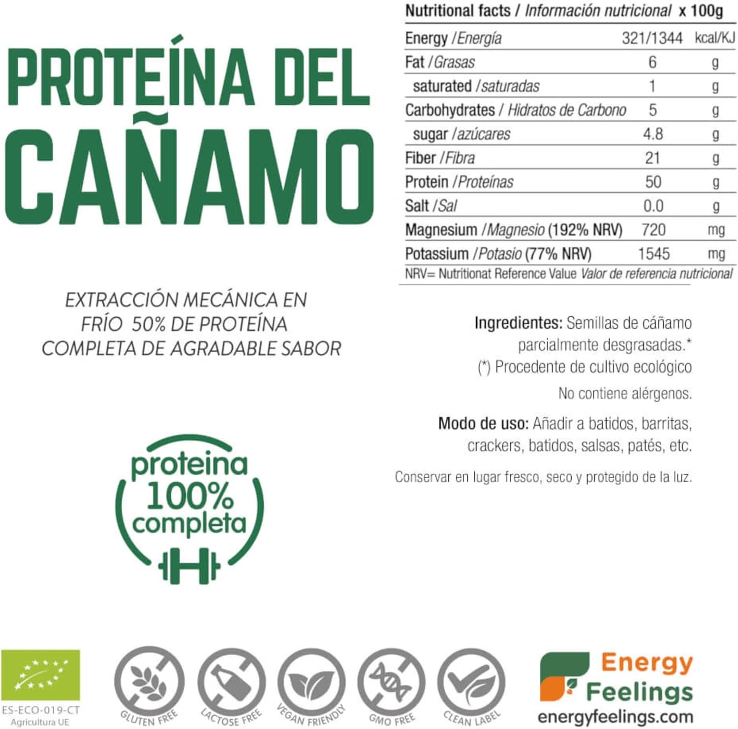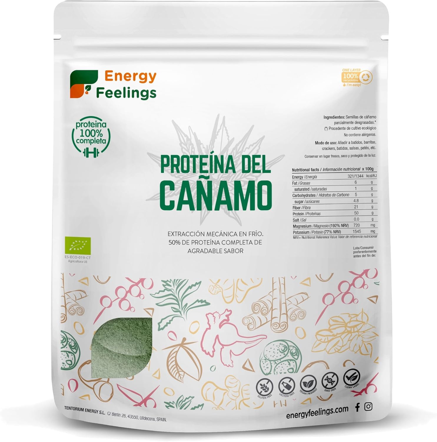 Energy Feelings Hemp Protein is a high-quality vegan protein powder, made exclusively from partially defatted hemp seeds. With a protein intake of 50% per 100 grams, it is an excellent option for athletes, active people and those who follow a vegan diet. Its nutritional profile makes it suitable for everyone: it is 100% vegetable, gluten-free, lactose-free and without added sugar, which makes it an ideal alternative for people with intolerances or who follow specific diets. In addition, its high fiber content (21%) contributes to intestinal transit and promotes a greater feeling of satiety, thus supporting a healthy lifestyle. This protein comes from certified organic farming, which guarantees that it has been produced without pesticides or artificial additives, respecting both your health and the environment. Thanks to its neutral taste, it can be easily integrated into a wide variety of preparations such as smoothies, creams, yogurts or pastry recipes, without modifying the original taste of your dishes. It comes in a practical 1 kg format, perfect for daily consumption and for those looking for an effective, natural and sustainable plant source of protein. Tips for use and applications: truffles, energy bars, crackers, croquettes, sauces, pâtes; can be used in various types of culinary preparations such as: energy bars truffles sweet crackers croquettes sauces pate smoothies juices. Storage: Store in closed containers, at room temperature, protected from direct light; in dry and clean conditions; lasting up to 24 months in original sealed packaging.