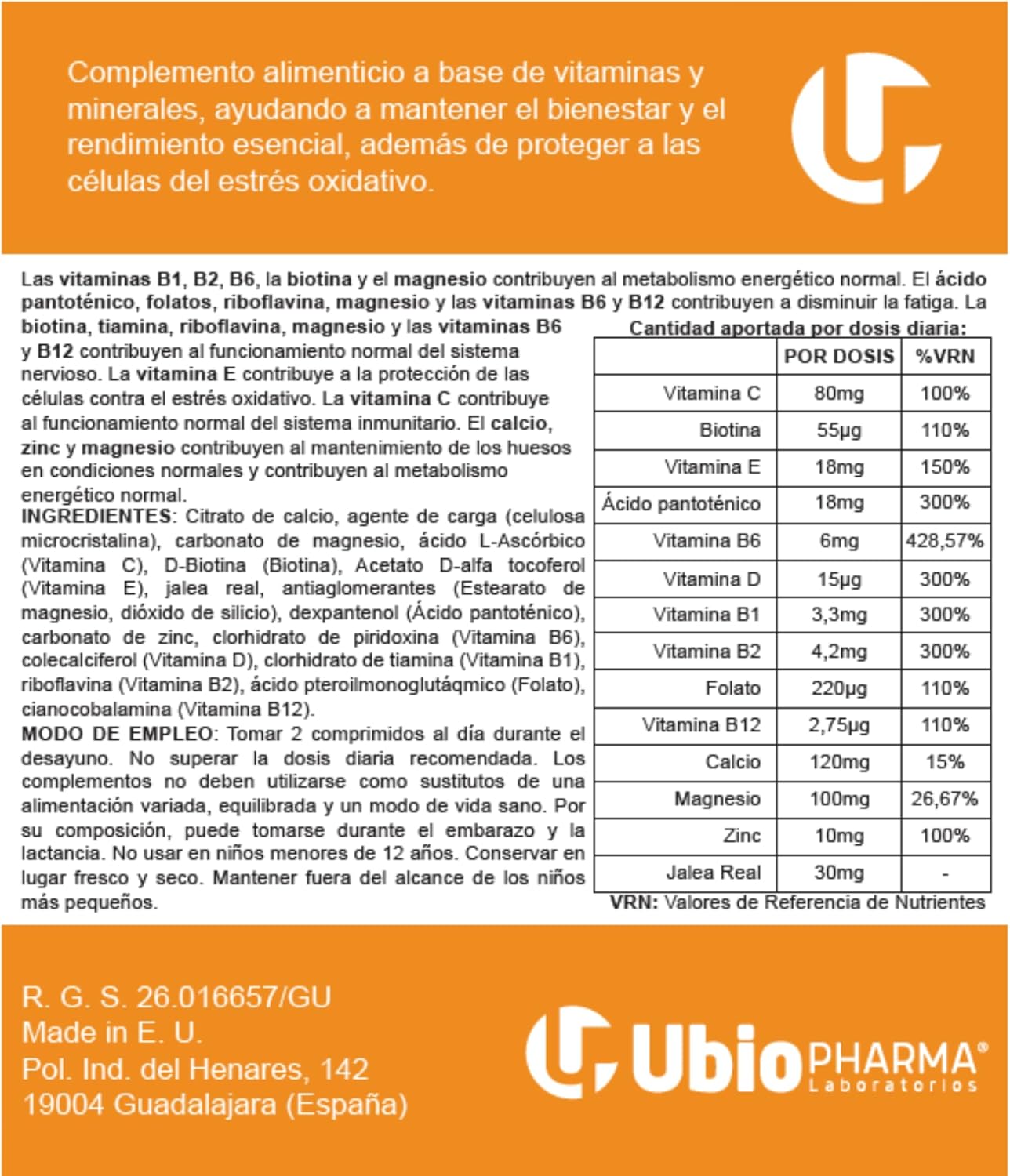 QLife Energy Multivitamin is a complete supplement that combines essential vitamins and minerals to help maintain energy, boost the immune system and protect cells against oxidative stress. Its balanced formula provides everything you need to combat tiredness and improve your overall well-being, becoming an indispensable ally for your day to day. B vitamins (B1, B2, B6 and B12) together with magnesium contribute to normal energy metabolism, helping to reduce fatigue and bring vitality naturally. This makes it an ideal supplement for those who lead an active pace of life, students during exams or workers with long hours. Vitamin C, vitamin D, calcium and zinc reinforce the defenses, supporting the immune system against external agents and helping to maintain bones and muscles under normal conditions. In addition, vitamin E acts as a powerful antioxidant, protecting cells from oxidative damage and helping to delay the effects of cell aging. On the other hand, nutrients such as biotin, riboflavin and pantothenic acid favor the proper functioning of the nervous system, helping mental balance and improving daily concentration. Unlike other generic multivitamins, QLife Energy Multivitamin precisely combines the right doses of each vitamin and mineral, ensuring effective absorption and complete coverage of basic nutritional needs. Thanks to its easy-to-take tablet format, it adapts comfortably to any routine. With just one supplement, you’ll have comprehensive support to maintain energy, strengthen defenses and take care of your health every day.