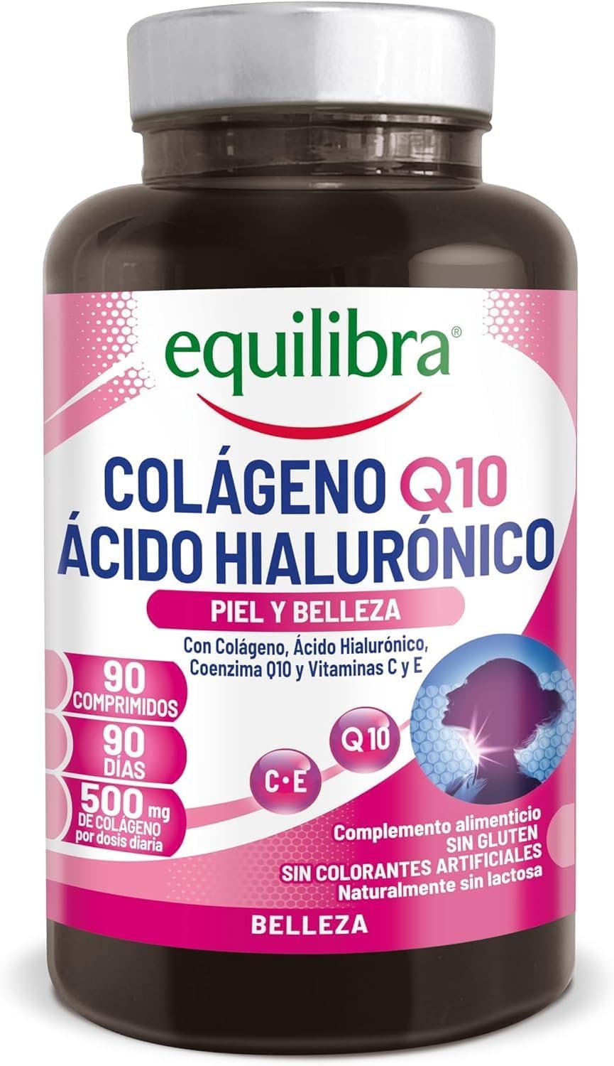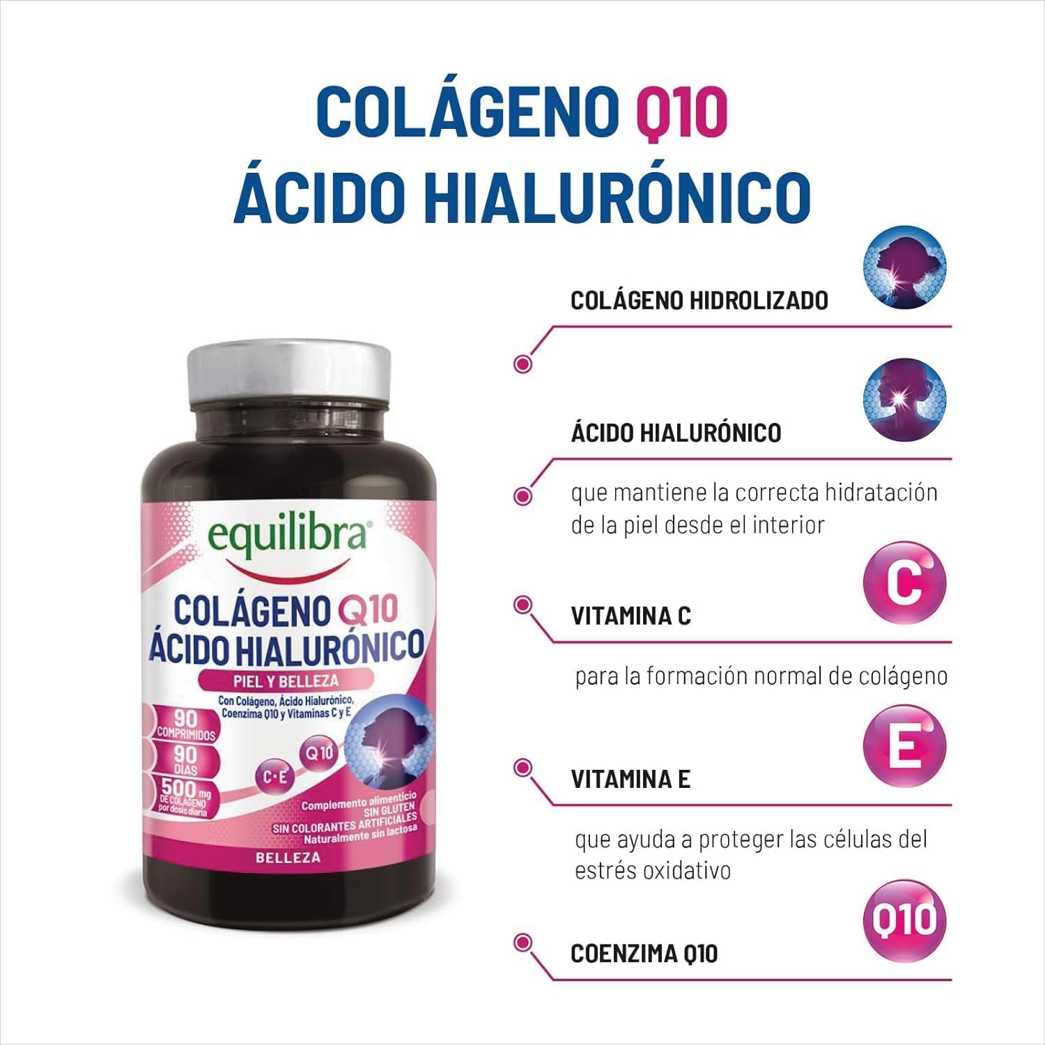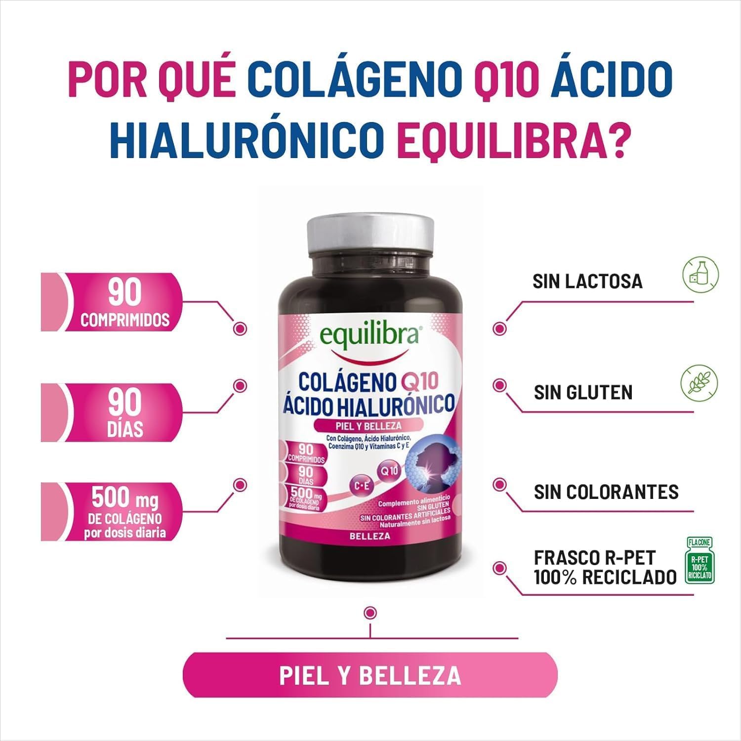 Collagen Q10 Hyaluronic Acid Equilibra is a food supplement in tablets with hydrolyzed collagen, low molecular weight hyaluronic acid, coenzyme Q10 and vitamins C and E, formulated for the good condition of the skin. Hydrolyzed collagen and hyaluronic acid are found naturally in the skin. Vitamin C contributes to the normal formation of collagen for normal skin functioning. Vitamin E contributes to the protection of cells against oxidative damage. Take 1 tablet daily with a glass of water. Take preferably in the morning. Take regularly for at least 8-12 weeks.