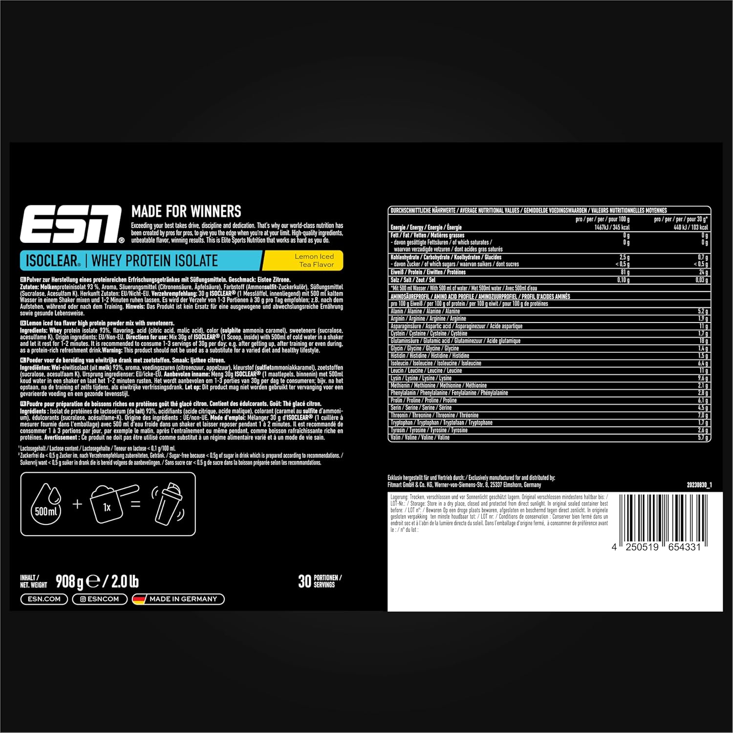 INNOVATION: The patented Isoclear Whey Isolate is very easy to digest, is produced naturally gently, and is therefore intact and biologically highly available. Its excellent amino acid profile, with 48.9% EAA and 22.7% BCAAs, is extraordinary.
