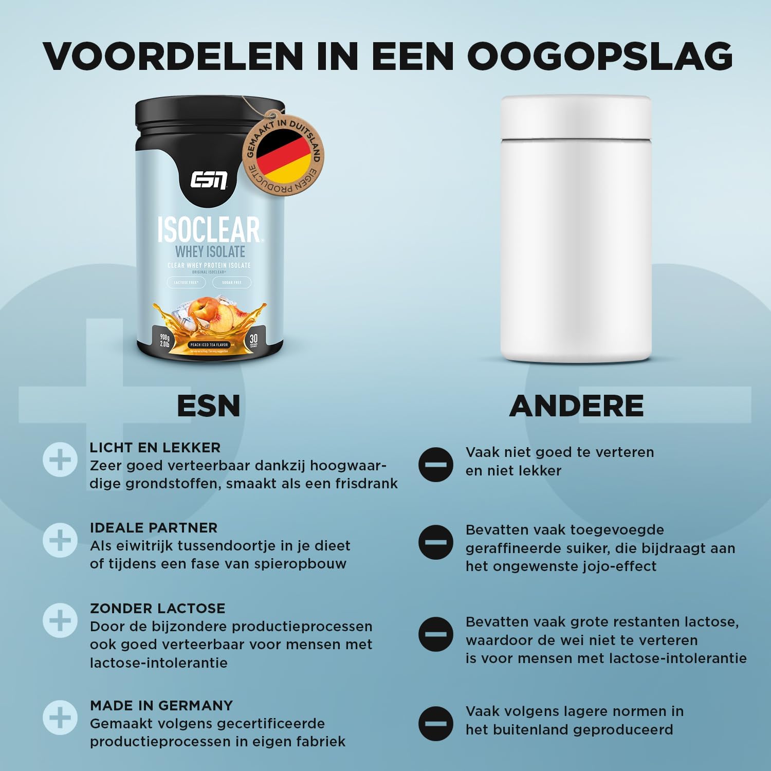 INNOVATION: The patented Isoclear Whey Isolate is very easy to digest, is produced naturally gently, and is therefore intact and biologically highly available. Its excellent amino acid profile, with 48.9% EAA and 22.7% BCAAs, is extraordinary.
