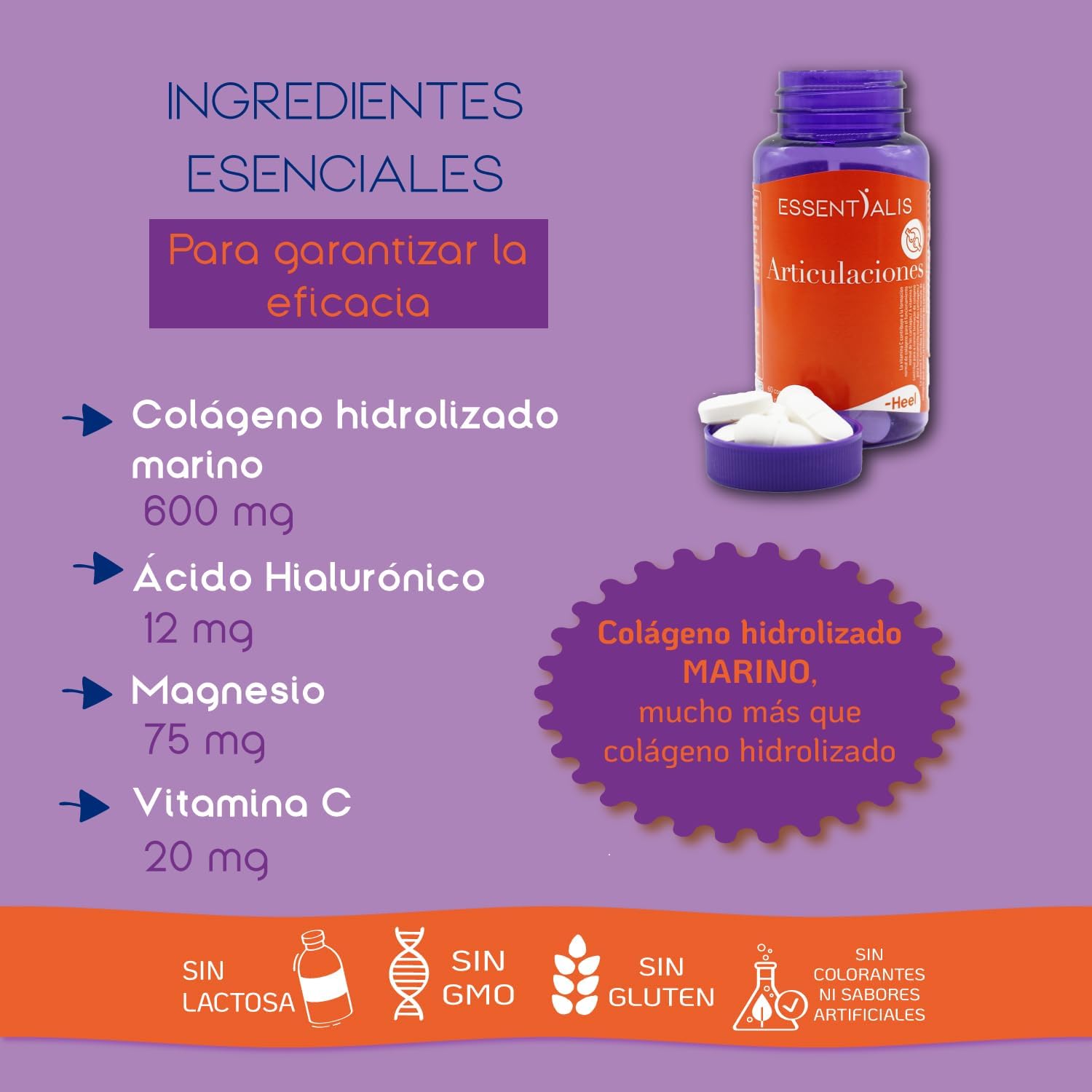 ACTION OF INGREDIENTS. With marine hydrolyzed collagen that has higher bioavailability. Collagen contributes to improving joint elasticity and strength. Vitamin C is essential for the formation of collagen in the body. Hyaluronic acid is an essential component for the functioning of joints as it prevents cartilage degeneration, lubricates the joint and enhances mobility. Magnesium promotes muscle recovery and prevents muscle hypercontractility, thus contributing to the protection of the joints.