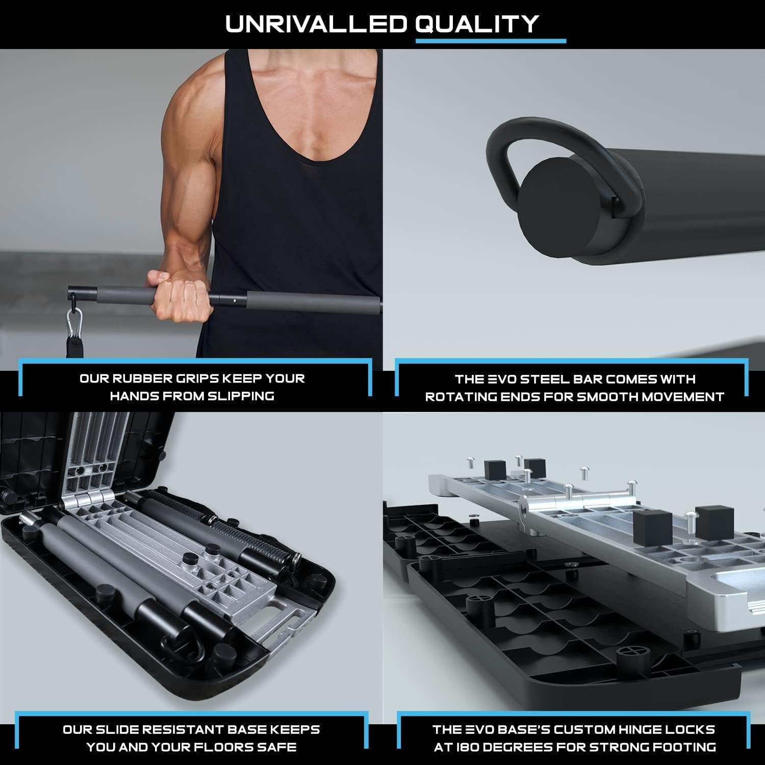 MAXIMUM TENSION AND MAXIMUM RESULTS – EVO Gym provides an unsurpassed workout Reinforced with aircraft grade aluminum, our base will never wobble or bend when you load it up for your workout. With EVO bands, you don’t have to worry about maintaining tension when performing movements. Squats, deadlifts, presses. Whatever. It just works!