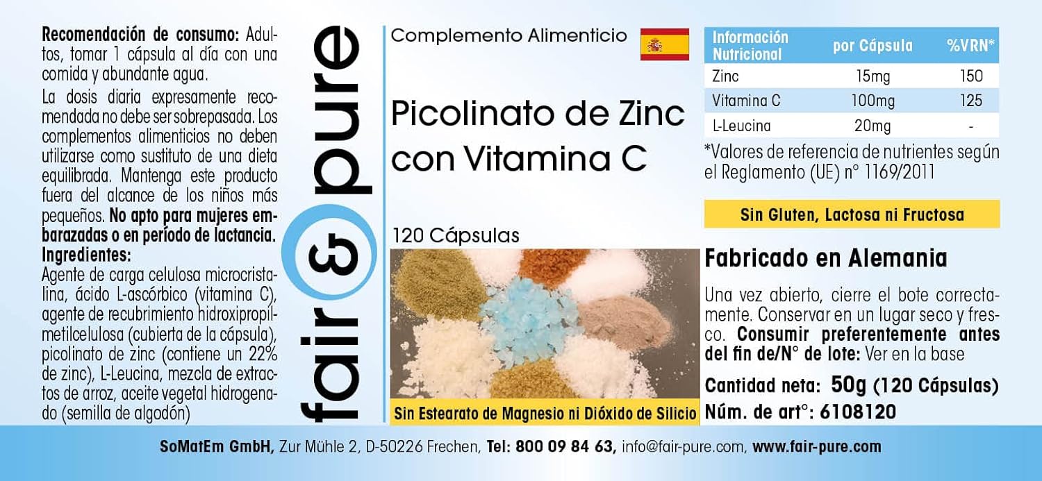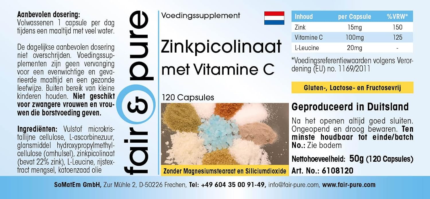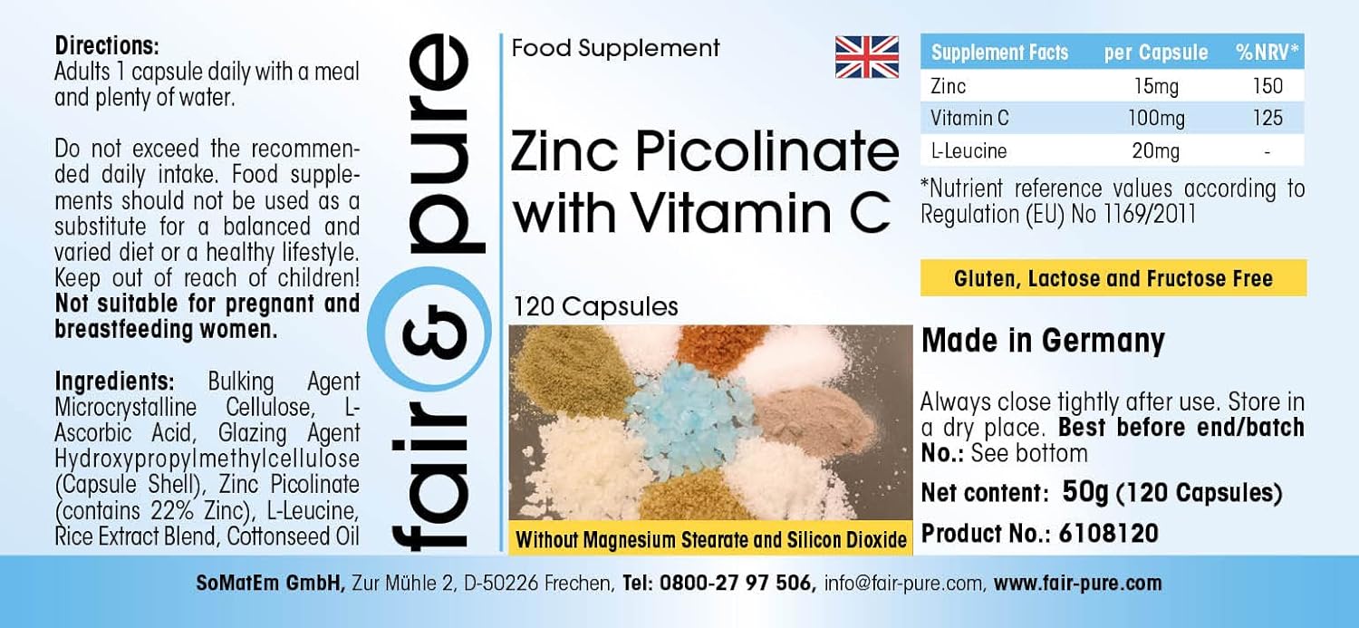 For Your Health: Zinc Picolinate with Vitamin C, Vegan, 120 Capsules The product contains no gluten, fructose, lactose, magnesium stearate, silicon dioxide, dyes, flavorings and preservatives.