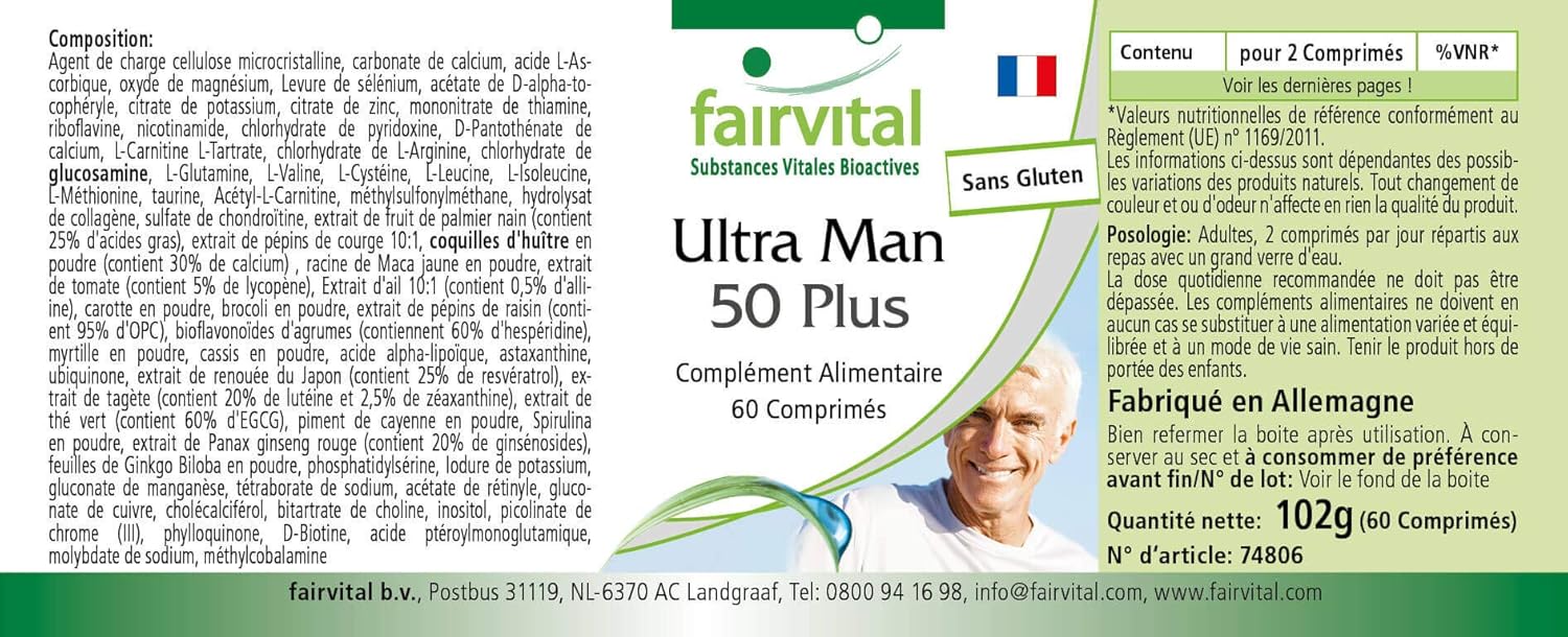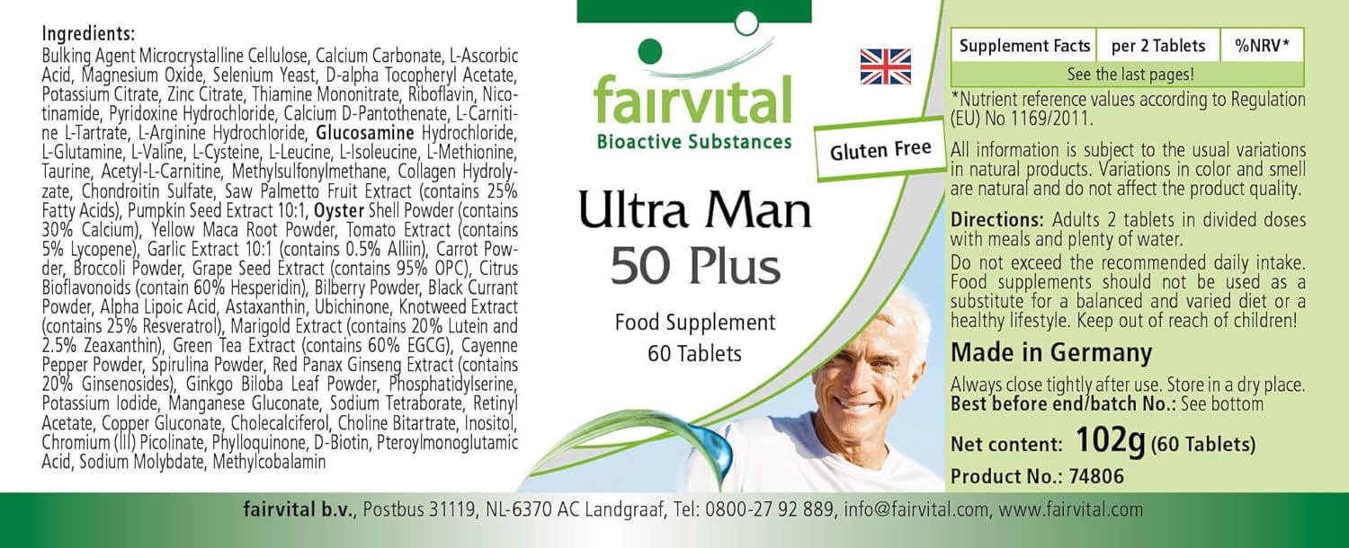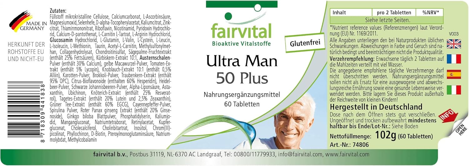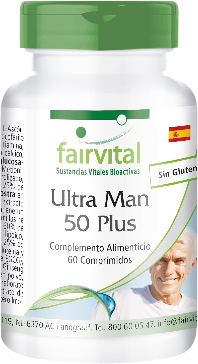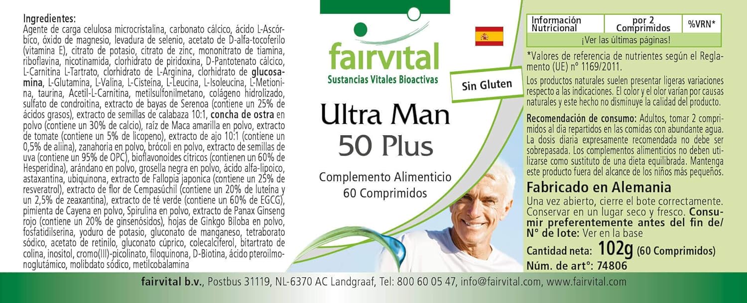 Vitaminas Para Hombres de Fairvital Más de 50 sustancias vitales en cada comprimidoLo justo para la salud masculinaTambién apto para mujeres.para más energíaFavorece la producción de espermapara un nivel normal de testosteronafavorece la protección celularsin glutensin estearato de magnesio ni dióxido de silicio