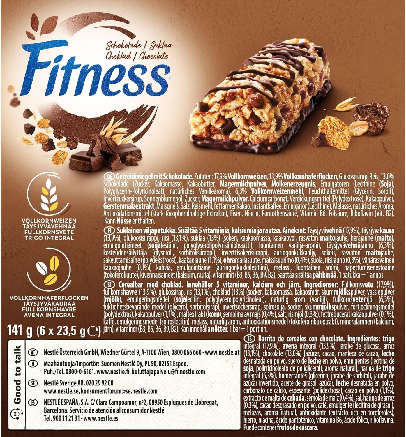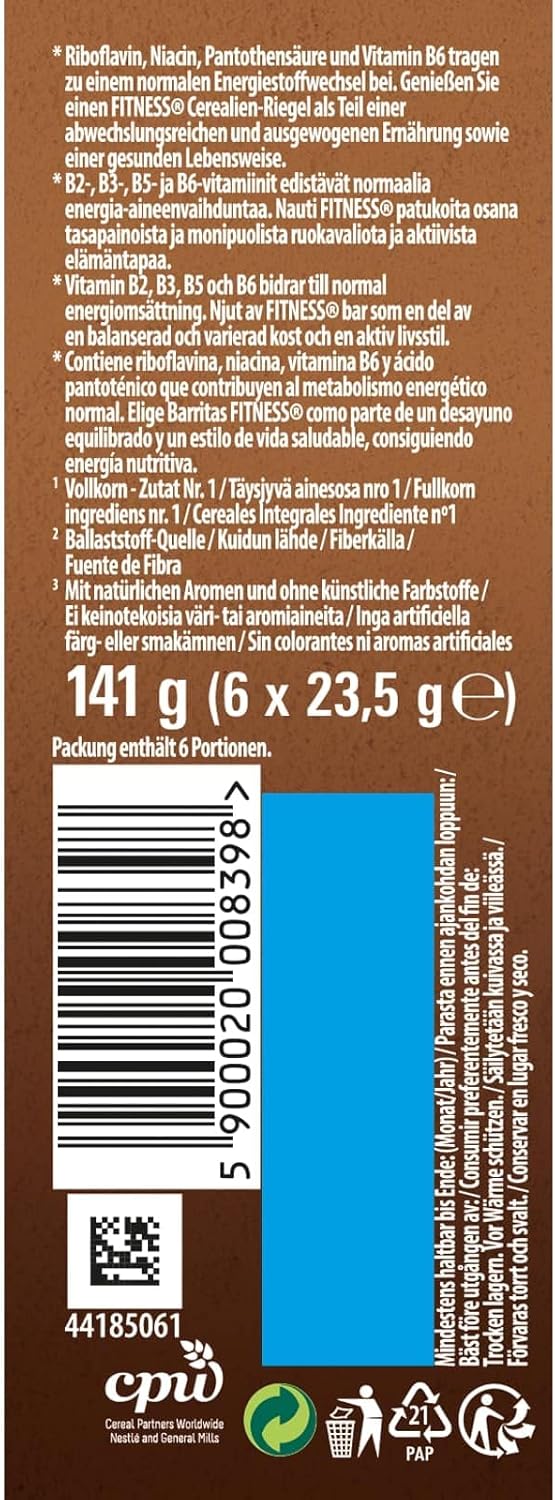 Delicious FITNESS cereal bars with a base of dark chocolate and nuggets on top. They are a source of fiber, have no dyes or preservatives and do not contain palm oil. For breakfast wherever you want.